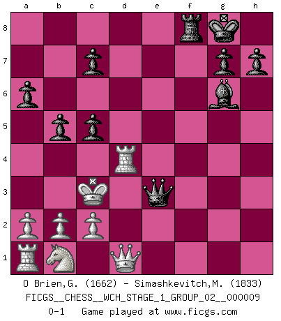Last move : 0-1 2011 May 4 8:47:8 [Event "FICGS__CHESS__WCH_STAGE_1_GROUP_02__000009"] [Site "FICGS"] [Date "2011.04.01"] [Round "1"] [White "O Brien,Glenn"] [Black "Simashkevitch,Mykola"] [Result "0-1"] [WhiteElo "1662"] [BlackElo "1833"] 1.e4 e5 2.Nf3 Nc6 3.Bb5 a6 4.Ba4 Nf6 5.O-O b5 6.Bb3 Be7 7.Bd5 O-O 8.Bxc6 dxc6 9.Nxe5 Qd6 10.d4 Nxe4 11.Re1 f6 12.Rxe4 fxe5 13.Qe2 Qg6 14.h4 Bh3 15.g3 Rxf2 16.Kxf2 Rf8+ 17.Bf4 exf4 18.gxf4 Bxh4+ 19.Ke3 Qg1+ 20.Kd2 Bf5 21.Re3 Bg6 22.Qd1 Qf2+ 23.Qe2 Qxf4 24.Kc3 Bf2 25.Rd3 c5 26.Qd1 Bxd4+ 27.Rxd4 Qe3+ 0-1 Ruy Lopez : 5.O-O Kingside Castling by player White (move 5) Kingside Castling by player Black (move 7) Player Black won this chess game. Follow this game move after move (download)Fischer is completely natural. He plays no roles. He's like a child. Very, very simple. (Zita Rajcsanyi) Heutzutage gewinnt im Turnier nicht derjenige Spieler, der weitreichende Pläne entwirft, sondern einfach jener, der Zug um Zug kämpft. (David Bronstein) Si el ingenio solamente fuese necesario para lucirse, las mujeres serían las mejores jugadoras de Ajedrez del mundo. (Albin) On entre au jeu d'Echecs comme on entre en Religion. Pour le joueur d'Echecs, la partie d'Echecs c'est l'office, la messe, le défilé du 1er Mai, le dépôt de gerbe au Monument aux Morts. C'est un drame sacré. (Michel Roos) Vladimir Ras-Putin is still alive... He is also a good actor, I saw him in the Lord of the Rings. (Rodolfo d'Ettorre)