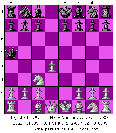 Last move : 1-0 2011 May 10 5:59:25 [Event "FICGS__CHESS__WCH_STAGE_1_GROUP_02__000009"] [Site "FICGS"] [Date "2011.04.01"] [Round "1"] [White "Geguchadze,Alexander"] [Black "Vacenovski,Vjekoslav"] [Result "1-0"] [WhiteElo "1334"] [BlackElo "1700"] 1.e4 d5 2.exd5 Qxd5 3.Nc3 Qa5 4.d4 1-0 This chess game has been lost on time (started : 2011.04.01 9:59:47) Scandinavian (centre counter) defense Player White won this chess game. Follow this game move after move (download)When you play Bobby, it is not a question if you win or lose. It is a question if you survive. (Boris Spassky) Versuche, dich von der Sklaverei der Eröffnungsvarianten zu befreien. Stattdessen soll man gewisse Typenpositionen erlernen, die man eingehend analysiert. (Aaron Nimzowitsch) Tu puedes aprender mucho mas de una partida que pierdas que de una partida ganada. Tendras que perder cientos de partidas antes de llegar a ser un buen jugador. (Jose Raul Capablanca) Si le désir cupide (et stupide) de gagner est une inépuisable source de souffrance, une combinaison brillante sur l'échiquier est une découverte : le coquelicot qui s'épanouit lorsque apparaît la Voie Lactée. (Arrabal) There is a very easy way to return from a casino with a small fortune : go there with a large one. (Jack Yelton)