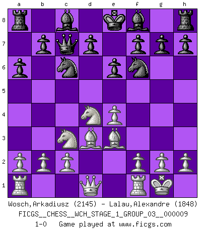Last move : 1-0 2011 May 28 6:52:29 [Event "FICGS__CHESS__WCH_STAGE_1_GROUP_03__000009"] [Site "FICGS"] [Date "2011.04.01"] [Round "1"] [White "Wosch,Arkadiusz"] [Black "Lalau,Alexandre"] [Result "1-0"] [WhiteElo "2145"] [BlackElo "1848"] 1.e4 c5 2.Nf3 e6 3.d4 cxd4 4.Nxd4 a6 5.Nc3 Qc7 6.Bd3 Nc6 7.Be3 Nf6 8.O-O 1-0 This chess game has been lost on time (started : 2011.04.01 10:1:50) Sicilian : Kan, 5.Nc3 Kingside Castling by player White (move 8) Player White won this chess game. Follow this game move after move (download)I love all positions. Give me a difficult positional game, I will play it. But totally won positions, I cannot stand them. (Hein Donner) Je mehr ich von der FIDE weiss, um so weniger verstehe ich. (Alexander Kalifman) El Peón aislado arroja penumbra sobre todo el tablero. (Aaron Nimzovich) Des points faibles ou des trous dans la position de l'adversaire doivent être occupés par des pièces et non pas par des pions. (Siegbert Tarrasch) As the days dwindle down... to a precious few. (Maxwell Anderson)
