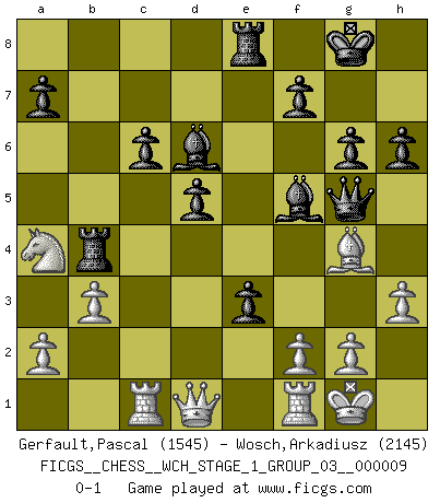 Last move : 0-1 2011 July 1 8:17:33 [Event "FICGS__CHESS__WCH_STAGE_1_GROUP_03__000009"] [Site "FICGS"] [Date "2011.04.15"] [Round "1"] [White "Gerfault,Pascal"] [Black "Wosch,Arkadiusz"] [Result "0-1"] [WhiteElo "1545"] [BlackElo "2145"] 1.e4 c5 2.Nf3 Nc6 3.d4 cxd4 4.Nxd4 Nf6 5.Nxc6 bxc6 6.e5 Qa5+ 7.Nc3 Qxe5+ 8.Be3 Rb8 9.Qc1 Ng4 10.Rb1 d5 11.Be2 Nxe3 12.Qxe3 Qc7 13.O-O e5 14.Qg5 h6 15.Qg3 g6 16.b3 Bd6 17.h3 O-O 18.Rbd1 Bf5 19.Na4 Bxc2 20.Rc1 Bf5 21.Qe3 e4 22.Qd4 Rfe8 23.Nc5 Qe7 24.Na4 Rb4 25.Qd1 Qg5 26.Bg4 e3 0-1 Sicilian defense Kingside Castling by player White (move 13) Kingside Castling by player Black (move 17) Player Black won this chess game. Follow this game move after move (download)If cunning alone were needed to excel, women would be the best Chess players. (Albin) Ich weiss nicht was Gott gegen mich auf 1.e4 antworten würde. (Robert James Fischer) Debió haber existido una vez en que los hombres eran semidióses, de otra manera no hubiesen podido inventar el Ajedrez. (Gustav Schenk) La vie et les Echecs sont tous les deux une lutte constante. (Lasker) Good luck. You're gonna need it. (Han Solo in Star Wars ep.6)