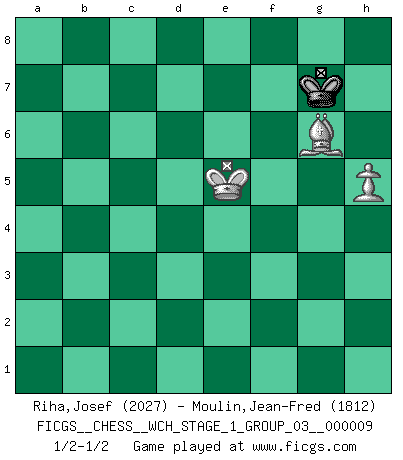Last move : 1/2-1/2 2011 May 25 16:35:53 [Event "FICGS__CHESS__WCH_STAGE_1_GROUP_03__000009"] [Site "FICGS"] [Date "2011.04.01"] [Round "1"] [White "Riha,Josef"] [Black "Moulin,Jean-Fred"] [Result "1/2-1/2"] [WhiteElo "2027"] [BlackElo "1812"] 1.d4 d5 2.c4 Nf6 3.Nf3 Bg4 4.Ne5 Nc6 5.Nxg4 Nxg4 6.e4 Nxf2 7.Kxf2 dxe4 8.d5 e6 9.Be3 Ne5 10.Nc3 exd5 11.Qa4+ Qd7 12.Qxd7+ Kxd7 13.cxd5 Ng4+ 14.Ke2 Re8 15.Bd4 f5 16.Kd1 Bd6 17.Bb5+ c6 18.dxc6+ bxc6 19.Be2 Ne5 20.Bxa7 Ra8 21.Be3 Rhb8 22.Rb1 Rb7 23.Kc2 g6 24.Rbd1 Ke6 25.g4 Rab8 26.b3 c5 27.Rhf1 c4 28.gxf5+ gxf5 29.Rxd6 Kxd6 30.Rxf5 cxb3+ 31.axb3 Ke6 32.Rh5 Rxb3 33.Bf4 Rb2+ 34.Kd1 Ng6 35.Bxb8 Rxb8 36.Nxe4 Rb1+ 37.Kc2 Re1 38.Bc4+ Ke7 39.Rxh7+ Kd8 40.Ng5 Re7 41.Kc3 Rxh7 42.Nxh7 Ne5 43.Bd5 Ke7 44.Kd4 Ng6 45.Be4 Nf8 46.Nxf8 Kxf8 47.h4 Kg7 48.h5 Kh6 49.Bg6 Kg7 50.Ke5 1/2-1/2 QGD : Marshall defense 10 pieces endgame at move 35 : White KRBNP , Black KRNPP WHITE : King + 1 Rook 1 Bishop 1 Knight 1 Pawn BLACK : King + 1 Rook 1 Knight 2 Pawns 9 pieces endgame at move 36 : White KRBNP , Black KRNP WHITE : King + 1 Rook 1 Bishop 1 Knight 1 Pawn BLACK : King + 1 Rook 1 Knight 1 Pawn 8 pieces endgame at move 39 : White KRBNP , Black KRN WHITE : King + 1 Rook 1 Bishop 1 Knight 1 Pawn BLACK : King + 1 Rook 1 Knight 7 pieces endgame at move 41 : White KBNP , Black KRN WHITE : King + 1 Bishop 1 Knight 1 Pawn BLACK : King + 1 Rook 1 Knight 6 pieces endgame at move 42 : White KBNP , Black KN WHITE : King + 1 Bishop 1 Knight 1 Pawn BLACK : King + 1 Knight 5 pieces endgame at move 46 : White KBNP , Black K WHITE : King + 1 Bishop 1 Knight 1 Pawn BLACK : King + 4 pieces endgame at move 46 : White KBP , Black K WHITE : King + 1 Bishop 1 Pawn BLACK : King + This chess game ended in a draw. Follow this game move after move (download)Every Pawn is a potential Queen. (James Mason) Die westlichen Werte sind eine Sprache, welche die Putin-Administration nicht versteht. (Garry Kasparov) Tu puedes aprender mucho mas de una partida que pierdas que de una partida ganada. Tendras que perder cientos de partidas antes de llegar a ser un buen jugador. (Jose Raul Capablanca) Je fais ceci parce que dans cinquante coups j'obtiendrai cela; je m'appelle Mikhail Moisevitch Botvinnik. (Botvinnik) Programming can only do so much before it becomes too much. (Don Groves)