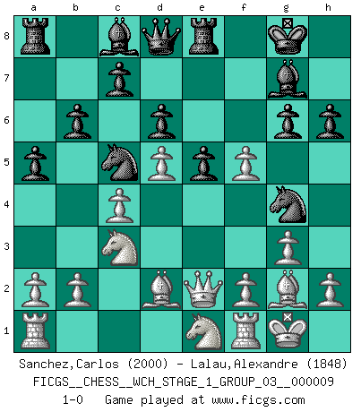 Last move : 1-0 2011 May 26 18:46:18 [Event "FICGS__CHESS__WCH_STAGE_1_GROUP_03__000009"] [Site "FICGS"] [Date "2011.04.01"] [Round "1"] [White "Sanchez,Carlos"] [Black "Lalau,Alexandre"] [Result "1-0"] [WhiteElo "2000"] [BlackElo "1848"] 1.d4 Nf6 2.c4 g6 3.g3 Bg7 4.Nf3 O-O 5.Bg2 d6 6.O-O Nbd7 7.Nc3 e5 8.e4 Re8 9.d5 Nc5 10.Ne1 a5 11.Bg5 h6 12.Be3 b6 13.Qe2 Ng4 14.Bd2 f5 15.exf5 1-0 This chess game has been lost on time (started : 2011.04.01 10:1:50) King's Indian : 3.g3 Kingside Castling by player Black (move 4) Kingside Castling by player White (move 6) Player White won this chess game. Follow this game move after move (download)Look at Garry Kasparov. After he loses, invariably he wins the next game. He just kills the next guy. That's something that we have to learn to be able to do. (Maurice Ashley) Du weisst es gibt ein Problem mit Computern und Fernschach, wenn jeder eine Rating von 2450 hat. (John Christen Knudsen) La pasion por jugar al Ajedrez es una de las mas inexplicables en el mundo. (H.G. Wells) C'est une question de caractère, Beaucoup de gens perdent leur motivation très vite. D'autres, ils sont rares, peuvent la conserver très longtemps. J'aime les échecs, encore aujourd'hui je suis heureux d'analyser des parties. J'aime toujours gagner, je déteste encore perdre. Bien jouer est important pour mon intégrité intellectuelle et morale. Et puis les échecs vivent en ce moment une période historique grâce à Internet. Ils se développent dans les systèmes éducatifs à travers le monde. Ils sortent de leur ghetto, et c'est mon rôle de mener à bien cette révolution. (Gary Kasparov) The various flowers seem good to different people. (Chinese proverb)