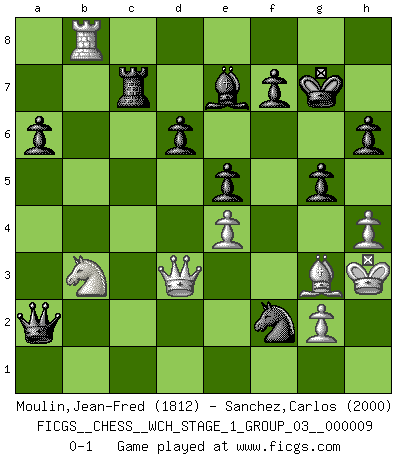 Last move : 0-1 2011 June 6 17:45:0 [Event "FICGS__CHESS__WCH_STAGE_1_GROUP_03__000009"] [Site "FICGS"] [Date "2011.04.01"] [Round "1"] [White "Moulin,Jean-Fred"] [Black "Sanchez,Carlos"] [Result "0-1"] [WhiteElo "1812"] [BlackElo "2000"] 1.e4 c5 2.d4 cxd4 3.Nf3 d6 4.Nxd4 Nf6 5.Nc3 a6 6.Bd3 e5 7.Nf3 Be7 8.O-O O-O 9.Bg5 Be6 10.Qe2 Nbd7 11.Rad1 Rc8 12.Rd2 h6 13.Bh4 Re8 14.h3 Qb6 15.Na4 Qb4 16.b3 g5 17.Bg3 b5 18.Nb2 Nc5 19.c4 bxc4 20.Nxc4 Nxd3 21.Rxd3 Bxc4 22.bxc4 Rxc4 23.Rb3 Qa4 24.Nd2 Rc2 25.Ra1 Rec8 26.Qd3 Rc1+ 27.Rxc1 Rxc1+ 28.Kh2 Qxa2 29.Rb8+ Kg7 30.Nb3 Rc7 31.h4 Ng4+ 32.Kh3 Nxf2+ 0-1 Sicilian : Smith-Morra gambit Kingside Castling by player White (move 8) Kingside Castling by player Black (move 8) Player Black won this chess game. Follow this game move after move (download)Robert Fischer is a law unto himself. (Larry Evans) Immer nach dem besten Zug zu suchen ist ziemlich unpraktisch. (Nigel Short) Coloca el contenido de las piezas del Ajedrez en un sombrero, agitalo vigorosamente, arrojalas en un tablero desde una altura de 30 centimetros y así obtendras el estilo de Steinitz. (H. E. Bird) Shah mat. Le roi est mort. Cri de fierté d'un joueur venant de terrasser son adversaire, courtoisement, sans effusion de sang. Are you threatening me, Master Jedi ? (Chancellor Palpatine in Star Wars ep.3)