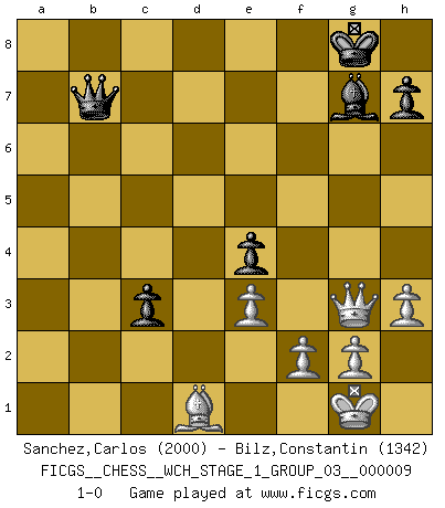 Last move : 1-0 2011 August 20 21:57:45 [Event "FICGS__CHESS__WCH_STAGE_1_GROUP_03__000009"] [Site "FICGS"] [Date "2011.04.01"] [Round "1"] [White "Sanchez,Carlos"] [Black "Bilz,Constantin"] [Result "1-0"] [WhiteElo "2000"] [BlackElo "1342"] 1.c4 d6 2.Nf3 e5 3.Nc3 f5 4.d4 e4 5.Ng5 Be7 6.Nh3 Nf6 7.e3 c6 8.Be2 Na6 9.O-O O-O 10.d5 Nd7 11.Rb1 Ne5 12.Nf4 g5 13.Nh5 Bd7 14.dxc6 bxc6 15.b4 Be6 16.b5 cxb5 17.Nxb5 Nc5 18.Qd4 Bf7 19.Ba3 a6 20.Bxc5 axb5 21.cxb5 Rxa2 22.Rb2 Rxb2 23.Qxb2 Bxh5 24.Bxh5 dxc5 25.Qxe5 Qd6 26.Qb2 g4 27.b6 Rb8 28.Rb1 c4 29.h3 Bf6 30.Qb5 c3 31.Qxf5 g3 32.b7 Qc6 33.Qg4+ Bg7 34.Qxg3 Rxb7 35.Rxb7 Qxb7 36.Bd1 1-0 English Opening Kingside Castling by player White (move 9) Kingside Castling by player Black (move 9) Player White won this chess game. Follow this game move after move (download)The King is a fighting piece. Use it ! (Wilhelm Steinitz) Die unerbitterlichsten Regeln im Schach sind die Ausnahmen. (Savielly Grigorievitsch Tartakower) Una clavada es mas poderosa que una espada. (Fred Reinfeld) Le jeu d'échecs est comme rejeté hors du temps. (Antoine de Saint-Exupéry) The right perception of any matter and a misunderstanding of the same matter do not wholly exclude each other. (Kafka's the trial)