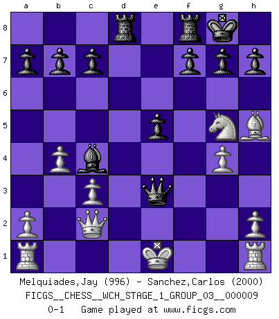 Last move : 0-1 2011 April 23 23:7:6 [Event "FICGS__CHESS__WCH_STAGE_1_GROUP_03__000009"] [Site "FICGS"] [Date "2011.04.15"] [Round "1"] [White "Melquiades,Jay"] [Black "Sanchez,Carlos"] [Result "0-1"] [WhiteElo "996"] [BlackElo "2000"] 1.e4 Nf6 2.d3 e5 3.f3 d5 4.Bg5 Be7 5.Ne2 Nc6 6.c3 dxe4 7.Bxf6 exf3 8.Bxe7 fxe2 9.Bxe2 Nxe7 10.Nd2 O-O 11.Bf3 Qxd3 12.Ne4 Qa6 13.Be2 Qb6 14.Bh5 Nf5 15.g4 Ne3 16.Qe2 Be6 17.b4 Bc4 18.Qf2 Rad8 19.Ng5 Nc2+ 20.Qxc2 Qe3+ 0-1 Alekhine's defense : Maroczy variation Kingside Castling by player Black (move 10) Player Black won this chess game. Follow this game move after move (download)The passion for playing Chess is one of the most unaccountable in the world. (H.G. Wells) Den Ruhm habe ich schon, jetzt brauche ich noch das Geld. (Wilhelm Steinitz) Solo existe una cosa que Fischer hace en el Ajedrez sin placer: ¡perder!. (Boris Spassky) On peut tirer plus d'utilité d'une partie perdue que de 100 parties gagnées. (Capablanca) In God we trust, all others we virus scan. (Anonymous)