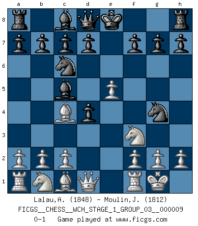 Last move : 0-1 2011 May 17 18:12:57 [Event "FICGS__CHESS__WCH_STAGE_1_GROUP_03__000009"] [Site "FICGS"] [Date "2011.04.01"] [Round "1"] [White "Lalau,Alexandre"] [Black "Moulin,Jean-Fred"] [Result "0-1"] [WhiteElo "1848"] [BlackElo "1812"] 1.e4 e5 2.Nf3 Nc6 3.d4 exd4 4.Bc4 Nf6 5.O-O Bc5 6.e5 Ng4 0-1 This chess game has been lost on time (started : 2011.04.01 10:1:50) Scotch gambit : Dubois-Reti defense Kingside Castling by player White (move 5) Player Black won this chess game. Follow this game move after move (download)You cannot play at Chess if you are kind-hearted. (French Proverb) Ich liebe den Moment, wenn ich das Ego meines Gegenüber breche. (Robert James Fischer) Fischer sacrificó virtualmente todo lo que la mayoría de nosotros los 'debiles' (término que él usa) valoramos, respetamos y apreciamos por el amor de un astuto, a menudo hermoso tablero de juego, por el privilegio ambivalente de ser su mas grande maestro. (Paul Kollar) Que feriez-vous si vous étiez en train de jouer aux échecs et que la fin du monde arrive ? Je continuerais à jouer. (Saint Borromée) Think like a man of action, act like a man of thought. (Henri Louis Bergson)
