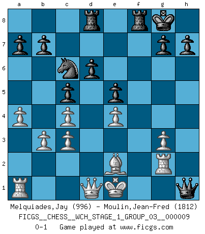 Last move : 0-1 2011 May 31 17:57:27 [Event "FICGS__CHESS__WCH_STAGE_1_GROUP_03__000009"] [Site "FICGS"] [Date "2011.04.15"] [Round "1"] [White "Melquiades,Jay"] [Black "Moulin,Jean-Fred"] [Result "0-1"] [WhiteElo "996"] [BlackElo "1812"] 1.e4 c5 2.Nf3 Nc6 3.c3 Nf6 4.d3 e5 5.Bg5 d6 6.Nbd2 Be7 7.h4 O-O 8.Bxf6 Bxf6 9.Nc4 Be6 10.Rg1 Bxh4 11.Nxh4 Qxh4 12.g3 Qf6 13.a4 Bxc4 14.dxc4 Rad8 15.Rg2 Qe6 16.b3 f5 17.f3 fxe4 18.fxe4 Qh6 19.Be2 Qh1+ 0-1 Sicilian defense Kingside Castling by player Black (move 7) Player Black won this chess game. Follow this game move after move (download)Kasparov : J'adoube , Ivanchuk : S'il vous plaît ! (Garry Kasparov & Vassily Ivanchuk, Linares 1997) Die jungen Leute sollen verstehen, dass sie noch etwas von mir lernen können – und müssen. (Viktor Kortschnoi) Aún deseo matar a Fischer. (Boris Spassky) Il vaut toujours mieux jouer un plan faux de façon logique que de n'avoir pas de plan du tout. (Victor Kortchnoï) A cynic is a man who knows the price of everything but the value of nothing. (Oscar Wilde)