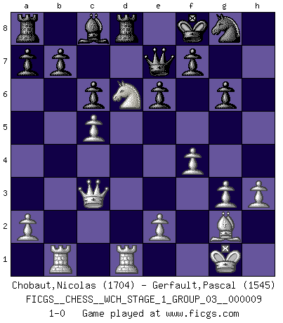 Last move : 1-0 2011 June 2 20:35:4 [Event "FICGS__CHESS__WCH_STAGE_1_GROUP_03__000009"] [Site "FICGS"] [Date "2011.04.15"] [Round "1"] [White "Chobaut,Nicolas"] [Black "Gerfault,Pascal"] [Result "1-0"] [WhiteElo "1704"] [BlackElo "1545"] 1.c4 Nf6 2.Nc3 g6 3.g3 Bg7 4.Bg2 c6 5.d4 O-O 6.Nf3 d5 7.O-O e6 8.b3 Nbd7 9.Bb2 dxc4 10.bxc4 Nb6 11.Qb3 Nbd7 12.Rfd1 Re8 13.Ne5 Qb6 14.Qc2 Nxe5 15.dxe5 Ng4 16.Ne4 Nxe5 17.Rab1 Qc7 18.f4 Ng4 19.Bxg7 Kxg7 20.Qc3+ Kf8 21.h3 Nh6 22.Nf6 Rd8 23.Nxh7+ Kg8 24.Nf6+ Kf8 25.Ne4 Ng8 26.c5 Qe7 27.Nd6 1-0 English Opening Kingside Castling by player Black (move 5) Kingside Castling by player White (move 7) Player White won this chess game. Follow this game move after move (download)Fischer is the strongest player in the world. In fact, the strongest player who ever lived. (Larry Evans) Wenn Du einsam bist, wenn Du Dich in der Welt wie ein Fremder fühlst, spiele Schach. Das wird Deinen Geist erheben und Dein Ratgeber im Kampf sein. (Aristoteles) La enorme capacidad mental, en la que sin ella no puede un jugador de Ajedrez existir, es demasiado requerida por el Ajedrez al grado de que nunca podrá liberar su mente de este juego. (Albert Einstein) Les échecs sont plus proches de l'art de l'assassinat que de l'art de la guerre. (Arturo Perez-Reverte) Happy endings are just stories that haven't finished yet. (Jane Smith in Mr & Mrs Smith)