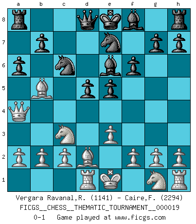 Last move : 0-1 2007 February 6 15:6:54 [Event "FICGS__CHESS__THEMATIC_TOURNAMENT__000019"] [Site "FICGS"] [Date "2006.12.15"] [Round "1"] [White "Vergara Ravanal,Raul Andres"] [Black "Caire,Francois"] [Result "0-1"] [WhiteElo "1141"] [BlackElo "2294"] 1.Nc3 c5 2.d4 cxd4 3.Qxd4 Nc6 4.Qh4 d5 5.e3 f6 6.Bb5 e5 7.Qa4 Nge7 8.Bd2 Be6 9.Rd1 a6 0-1 This chess game has been lost on time (started : 2006.12.15 1:39:58) Novosibirsk Opening Player Black won this chess game. Follow this game move after move (download)The tactician must know what to do whenever something needs doing; the strategist must know what to do when nothing needs doing. (Savielly Tartakover) Dein Körper muss in Topform sein. Dein Schach verfällt, wenn dein Körper verfällt. Der Körper kann nicht vom Geist getrennt werden. (Robert James Fischer) Dios mío, Bobby Fischer juega tan simple. (Alexei Suetin) Je ne suis pas le dernier à jouer lâchement des coups douteux pendant le zeïtnot de l'adversaire pour l'achever: en effet les coups qui font le plus peur sont ceux que l'on ne comprend pas. Je me fais souvent peur quand je joue. (Un professeur anonyme) As the days dwindle down... to a precious few. (Maxwell Anderson)