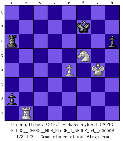 Last move : 1/2-1/2 2011 August 23 21:54:59 [Event "FICGS__CHESS__WCH_STAGE_1_GROUP_04__000009"] [Site "FICGS"] [Date "2011.04.01"] [Round "1"] [White "Dineen,Thomas"] [Black "Huebner,Gerd"] [Result "1/2-1/2"] [WhiteElo "2127"] [BlackElo "2028"] 1.d4 Nf6 2.c4 e6 3.Nf3 d5 4.Nc3 Bb4 5.e3 O-O 6.Bd3 c5 7.O-O Nc6 8.a3 Bxc3 9.bxc3 Qc7 10.a4 dxc4 11.Bxc4 Rd8 12.Qe2 b6 13.Bb2 Bb7 14.Bd3 Rac8 15.Rfd1 Na5 16.e4 h6 17.Nd2 Ne8 18.h3 Nd6 19.Nf3 Qc6 20.Re1 Qe8 21.Ba3 Bc6 22.dxc5 bxc5 23.Bc2 Bb7 24.Rab1 e5 25.Nh4 Bc6 26.Bxc5 Bxe4 27.Bxd6 Bxc2 28.Qxc2 Rxd6 29.Nf5 Rf6 30.Rb5 Nc4 31.Qd3 Kh8 32.Re2 Qe6 33.g4 Qc6 34.Rd5 Re6 35.Re4 Nb6 36.Rd6 Qxc3 37.Qxc3 Rxc3 38.a5 Nc4 39.Rd7 Nxa5 40.Rxf7 Nc6 41.Rxg7 Rxh3 42.Rc4 Rb3 43.Rc7 Rb6 44.Rc8+ Kh7 45.Kg2 a5 46.Rc7+ Kh8 47.f3 e4 48.fxe4 Ra6 49.Rc1 Rg6 50.Rb1 Rxg4+ 51.Kf3 Ne5+ 52.Kf2 a4 53.Rb8+ Rg8 54.R8b7 R8g6 55.Rh7+ Kg8 56.Rhe7 Ng4+ 57.Kf3 Kh8 58.Rh7+ Kg8 59.Rhc7 Kh8 60.Rc8+ Rg8 61.Rxg8+ Kxg8 62.Kxg4 a3 63.Rb8+ Kf7 64.Rb1 a2 1/2-1/2 Queen's pawn game Kingside Castling by player Black (move 5) Kingside Castling by player White (move 7) 10 pieces endgame at move 61 : White KRRNP , Black KRNPP WHITE : King + 2 Rooks 1 Knight 1 Pawn BLACK : King + 1 Rook 1 Knight 2 Pawns 9 pieces endgame at move 61 : White KRNP , Black KRNPP WHITE : King + 1 Rook 1 Knight 1 Pawn BLACK : King + 1 Rook 1 Knight 2 Pawns 8 pieces endgame at move 62 : White KRNP , Black KRPP WHITE : King + 1 Rook 1 Knight 1 Pawn BLACK : King + 1 Rook 2 Pawns This chess game ended in a draw. Follow this game move after move (download)I am still a victim of Chess. It has all the beauty of art and much more. It cannot be commercialized. Chess is much purer than art in its social position. (Marcel Duchamp) Ich habe kein Problem mit Frauen, sondern nur mit dem Niveau ihres Schachspiels (Judith Polgar) Fischer sacrificó virtualmente todo lo que la mayoría de nosotros los 'debiles' (término que él usa) valoramos, respetamos y apreciamos por el amor de un astuto, a menudo hermoso tablero de juego, por el privilegio ambivalente de ser su mas grande maestro. (Paul Kollar) Fischer est le meilleur joueur du monde et Karpov n'est qu'un joueur de bistrot. (Garry Kasparov, agé de 16 ans) The Internet is the world's largest library. It's just that all the books are on the floor. (John Allen Paulos)
