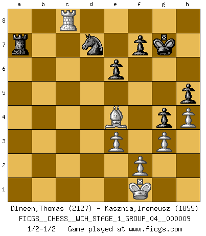 Last move : 1/2-1/2 2011 May 10 12:34:53 [Event "FICGS__CHESS__WCH_STAGE_1_GROUP_04__000009"] [Site "FICGS"] [Date "2011.04.01"] [Round "1"] [White "Dineen,Thomas"] [Black "Kasznia,Ireneusz"] [Result "1/2-1/2"] [WhiteElo "2127"] [BlackElo "1855"] 1.d4 Nf6 2.c4 e6 3.Nf3 d5 4.Nc3 Be7 5.g3 O-O 6.Bg2 dxc4 7.O-O Nc6 8.e3 Rb8 9.Qa4 Nb4 10.Ne5 Bd7 11.Qd1 c5 12.dxc5 Qc7 13.Nxd7 Qxd7 14.b3 Qc7 15.bxc4 Qxc5 16.Ba3 Qxc4 17.Rc1 Qa6 18.Qb3 Qa5 19.Ne2 Rfd8 20.Rc4 Nbd5 21.Ra4 Qb6 22.Bxe7 Nxe7 23.Rb4 Qa6 24.Nc3 Rd7 25.Ra4 Qb6 26.Qxb6 axb6 27.Rb4 Rc7 28.Na4 Ned5 29.Rb2 b5 30.Rxb5 Ra8 31.Nb6 Nxb6 32.Rxb6 Rxa2 33.Rxb7 Rxb7 34.Bxb7 g5 35.h3 g4 36.h4 Nd7 37.Be4 Kg7 38.Rc1 h5 39.Kf1 Ra7 40.Rc8 1/2-1/2 Queen's pawn game Kingside Castling by player Black (move 5) Kingside Castling by player White (move 7) This chess game ended in a draw. Follow this game move after move (download)A passed Pawn increases in strength as the number of pieces on the board diminishes. (Capablanca) Dass jemand wie Surab Asmaiparaschwili, der selbst Elopunkte gekauft hat , Vize-Präsident der Fide werden konnte, sagt schon einges über den Zustand dieser Organisation aus. (Joel Lautier) Todos los Maestros de Ajedrez fueron un día unos principiantes. (Chernev) Roi des jeux et jeu des rois, les échecs portent en eux un sentiment d'infini. Ils donnent à celui qui s'est efforcé d'en approfondir les arcanes l'impression de n'être pas à la mesure de l'homme; en fait, ils constituent un résumé de l'univers, un microcosme, et figurent cette grande échelle qui, dans les plans de la lumière descend jusqu'à la matière, qui des abîmes insondables remonte jusqu'en l'infini de Dieu. (Pyrame) You must have a dream in order to have it come true. (A.P.J. Kalam)
