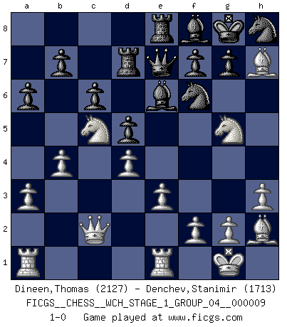 Last move : 1-0 2011 May 18 8:25:29 [Event "FICGS__CHESS__WCH_STAGE_1_GROUP_04__000009"] [Site "FICGS"] [Date "2011.04.01"] [Round "1"] [White "Dineen,Thomas"] [Black "Denchev,Stanimir"] [Result "1-0"] [WhiteElo "2127"] [BlackElo "1713"] 1.d4 d5 2.c4 c6 3.Nf3 Nf6 4.Nc3 e6 5.Bg5 Nbd7 6.cxd5 exd5 7.e3 Be7 8.Bd3 O-O 9.Qc2 Re8 10.O-O Nf8 11.h3 Be6 12.a3 Rc8 13.b4 a6 14.Rfe1 Rc7 15.Bf4 Rd7 16.Na4 Ng6 17.Ng5 Bf8 18.Bh2 Qe7 19.Nc5 Nh8 20.Bxh7+ 1-0 QGD Slav : 4.Nc3 Kingside Castling by player Black (move 8) Kingside Castling by player White (move 10) Player White won this chess game. Follow this game move after move (download)After a bad opening, there is hope for the middle game. After a bad middle game, there is hope for the endgame. But once you are in the endgame, the moment of truth has arrived. (Edmar Mednis) Ein Schachspiel besteht aus drei Phasen: Die erste, wenn du hofftst den Vorteil zu haben, die zweite, wenn du glaubst einen Vorteil zu haben, und die dritte.... wenn du weißt Du wirst verlieren. (Savielly Grigorievitsch Tartakower) a manera como él juega al Ajedrez, demuestra la completa naturaleza de un hombre. (Stanley Ellin) On peut tirer plus d'utilité d'une partie perdue que de 100 parties gagnées. (Capablanca) Man is still the most extraordinary computer of all. (John F. Kennedy)