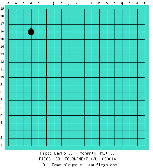 Last move : 1-0 2007 January 14 12:7:35 [Event "FICGS__GO__TOURNAMENT_KYU__000014"] [Site "FICGS"] [Date "2006.12.15"] [Round "1"] [Black "Pipac,Darko"] [White "Mohanty,Amit"] [Result "1-0"] 1.d16 1-0 This go game has been lost on time (started : 2006.12.15 2:14:43) Here are the names of the openings (joseki) played in the four corners : Player Black won this Go (weiqi, baduk) game. Follow this game move after move (download)Be a little patient. Keshi works ! (Anonymous) There are two types of people in this world, good and bad. The good sleep better, but the bad seem to enjoy the waking hours much more. (Woody Allen)