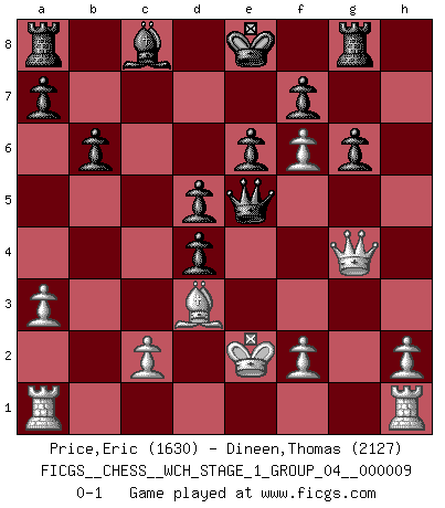 Last move : 0-1 2011 April 12 20:12:26 [Event "FICGS__CHESS__WCH_STAGE_1_GROUP_04__000009"] [Site "FICGS"] [Date "2011.04.01"] [Round "1"] [White "Price,Eric"] [Black "Dineen,Thomas"] [Result "0-1"] [WhiteElo "1630"] [BlackElo "2127"] 1.e4 e6 2.d4 d5 3.Nc3 Nf6 4.Bg5 Bb4 5.e5 h6 6.Be3 Ne4 7.Qg4 g6 8.a3 Bxc3+ 9.bxc3 c5 10.Bd3 h5 11.Qf3 Nxc3 12.Qg3 cxd4 13.Bg5 Qc7 14.Bf6 Rg8 15.Ne2 Nxe2 16.Kxe2 Nd7 17.Qg5 b6 18.g4 hxg4 19.Qxg4 Nxf6 20.exf6 Qe5+ 0-1 French : MacCutcheon, Janowski variation Player Black won this chess game. Follow this game move after move (download)The most powerful weapon in Chess is to have the next move. (David Bronstein) Ja, ich habe einmal eine Blitzpartie gespielt, es war in einem Zug, 1929. --im Interview 1989 (Mikhail Moiseyevich Botvinik) Aún el Rey más flojo huye despavorido ante la amenaza de un Jaque doble. (Aaron Nimzowitsch) Le moment que je préfère le plus dans une rencontre, c'est celui où je sens que la personnalité de l'adversaire se brise. (Robert Fischer) Just because you do not take an interest in politics doesn't mean politics won't take an interest in you. (Pericles 430 B.C.)