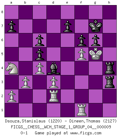 Last move : 0-1 2011 May 15 20:26:54 [Event "FICGS__CHESS__WCH_STAGE_1_GROUP_04__000009"] [Site "FICGS"] [Date "2011.04.01"] [Round "1"] [White "Dsouza,Stanislaus"] [Black "Dineen,Thomas"] [Result "0-1"] [WhiteElo "1220"] [BlackElo "2127"] 1.f4 d5 2.Nf3 g6 3.e3 Bg7 4.Be2 Nf6 5.O-O O-O 6.c4 c5 7.Ne5 Nc6 8.Nxc6 bxc6 9.Nc3 Rb8 10.b3 d4 11.Na4 dxe3 12.d3 Ng4 13.Bxg4 Qd4 14.Bb2 e2 15.Bxd4 Bxd4+ 16.Kh1 exd1Q 17.Raxd1 Bxg4 18.Rd2 Bf5 19.h3 h5 20.Rfd1 Rfe8 21.g4 hxg4 22.hxg4 Bxg4 23.Rf1 Kg7 24.Kh2 Rh8+ 25.Kg3 Rh3+ 26.Kxg4 Rbh8 27.f5 R8h4+ 28.Kg5 f6+ 0-1 Bird's Opening Kingside Castling by player White (move 5) Kingside Castling by player Black (move 5) Promotion Queen by player Black (move 16) Player Black won this chess game. Follow this game move after move (download)First-class players lose to second class players because second-class players sometimes play a first-class game. (Tarrasch) Der Schachmeister von Heute braucht Courage, einen Killerinstinkt, Ausdauer und Arroganz. (Larry Evans) Repentinamente, me resultaba obvio en mi analisis que yo había pasado por alto lo que Fischer había visto en el tablero con la mas grande facilidad. (Mikhail Botvinnik) Un journaliste : 'Vous préférez avoir une dame de plus sur l'échiquier ou au lit ?' Boris Spassky : 'Ca dépend de la position.' Warrior pose battles inner weakness and wins focus. You see that there is no war within you. You're on your own side, and you are your own strength. (Terri Guillemets)