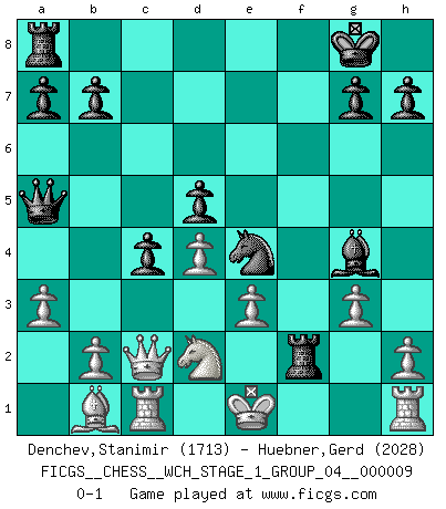 Last move : 0-1 2011 May 26 8:19:18 [Event "FICGS__CHESS__WCH_STAGE_1_GROUP_04__000009"] [Site "FICGS"] [Date "2011.04.01"] [Round "1"] [White "Denchev,Stanimir"] [Black "Huebner,Gerd"] [Result "0-1"] [WhiteElo "1713"] [BlackElo "2028"] 1.d4 Nf6 2.c4 e6 3.Nf3 Be7 4.Nc3 d5 5.Bf4 O-O 6.e3 Nbd7 7.Rc1 c5 8.cxd5 Nxd5 9.Nxd5 exd5 10.Bd3 c4 11.Bb1 Qb6 12.Qc2 Qa5+ 13.Nd2 f5 14.g4 Nf6 15.gxf5 Ne4 16.a3 Bxf5 17.Qd1 Bg4 18.Qc2 Bh4 19.Bg3 Bxg3 20.fxg3 Rf2 0-1 Queen's pawn game Kingside Castling by player Black (move 5) Player Black won this chess game. Follow this game move after move (download)Up to this point White has been following well-known analysis. But now he makes a fatal error: he begins to use his own head. (Siegbert Tarrasch) Unter Putin wird alles Geld aus Russland wie von einem Staubsauger nach Moskau umgeleitet, das ist wie ein schwarzes Loch. (Garry Kasparov) El pensamiento metódico es mas útil en el Ajedrez que la inspiración. (C. J. S. Purdy) Même un GMI sait rarement calculer sur plus de cinq coups une attaque à sacrifices. (Rudolf Spielmann) No, no, you're not thinking; you're just being logical. (Niels Bohr)