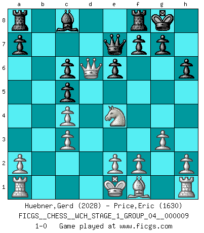 Last move : 1-0 2011 April 19 20:52:16 [Event "FICGS__CHESS__WCH_STAGE_1_GROUP_04__000009"] [Site "FICGS"] [Date "2011.04.01"] [Round "1"] [White "Huebner,Gerd"] [Black "Price,Eric"] [Result "1-0"] [WhiteElo "2028"] [BlackElo "1630"] 1.d4 Nf6 2.c4 e6 3.Nc3 Bb4 4.Nf3 c5 5.g3 Nc6 6.d5 Bxc3+ 7.bxc3 d6 8.dxc6 O-O 9.Bg5 bxc6 10.Nd2 h6 11.Bxf6 Qxf6 12.Ne4 Qe7 13.Qxd6 1-0 Nimzo-Indian : Three knights variation Kingside Castling by player Black (move 8) Player White won this chess game. Follow this game move after move (download)When you play Bobby, it is not a question if you win or lose. It is a question if you survive. (Boris Spassky) Ohne ihre Erfolge schmälern zu wollen würde ich sagen Petrosian, Spassky und Karpov verdanken ihre Siege ihren Trainern - Boleslavsky, Bondarevsky und Furman. (Mikhail Moiseyevich Botvinik) El Ajedrez es sobre todo, ¡una pelea!. (Emanuel Lasker) Un footballeur joue avec ses pieds, parfois avec sa tête. Un joueur d'échecs ne joue qu'avec sa tête. Et quand il ne joue plus, il meurt. (Jacob Murray) Ah, beer! The cause of, and the solution to, all of life's problems. (Homer Simpson)