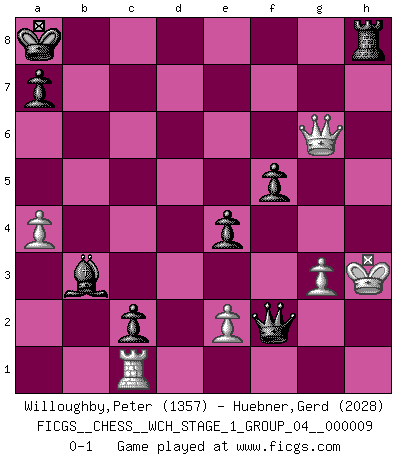 Last move : 0-1 2011 June 30 10:39:9 [Event "FICGS__CHESS__WCH_STAGE_1_GROUP_04__000009"] [Site "FICGS"] [Date "2011.04.01"] [Round "1"] [White "Willoughby,Peter"] [Black "Huebner,Gerd"] [Result "0-1"] [WhiteElo "1357"] [BlackElo "2028"] 1.d4 Nf6 2.g3 c5 3.Bg2 cxd4 4.Nf3 e5 5.O-O Nc6 6.Bg5 Qb6 7.b3 d5 8.a4 e4 9.Bxf6 exf3 10.Bxf3 gxf6 11.Bxd5 Be6 12.Bf3 O-O-O 13.Nd2 h5 14.Nc4 Qc7 15.Qd3 Ne5 16.Nxe5 fxe5 17.Rac1 f5 18.c3 Bh6 19.Bxb7+ Kxb7 20.Qb5+ Ka8 21.Rc2 Rb8 22.Qd3 Bxb3 23.Rb2 dxc3 24.R2b1 e4 25.Qa6 c2 26.Rbc1 Bxc1 27.Rxc1 h4 28.Qg6 hxg3 29.fxg3 Qc5+ 30.Kh1 Rxh2+ 31.Kxh2 Qf2+ 32.Kh3 Rh8+ 0-1 Queen's pawn game Kingside Castling by player White (move 5) Queenside Castling by player Black (move 12) Player Black won this chess game. Follow this game move after move (download)Becoming successful at Chess allows you to discover your own personality. That's what I want for the kids I teach. (Saudin Robovic) Die unerbitterlichsten Regeln im Schach sind die Ausnahmen. (Savielly Grigorievitsch Tartakower) La maestría del Ajedrez consiste esencialmente en analizar posiciónes de Ajedrez con precisión. (Mikhail Botvinnik) Même si l'adversaire joue le coup analysé précédemment, recommencez l'analyse en voyant la nouvelle position. Première règle de Blumenfeld All maxims have their antagonist maxims; proverbs should be sold in pairs, a single one being but a half truth. (William Mathews)