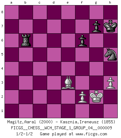 Last move : 1/2-1/2 2011 April 19 13:47:56 [Event "FICGS__CHESS__WCH_STAGE_1_GROUP_04__000009"] [Site "FICGS"] [Date "2011.04.01"] [Round "1"] [White "Magitz,Aaral"] [Black "Kasznia,Ireneusz"] [Result "1/2-1/2"] [WhiteElo "2000"] [BlackElo "1855"] 1.e4 e5 2.Nf3 Nf6 3.Nxe5 d6 4.Nf3 Nxe4 5.d4 d5 6.Bd3 Be7 7.O-O Nc6 8.Re1 O-O 9.c4 Nf6 10.Nc3 Bg4 11.cxd5 Nxd4 12.Bxh7+ Nxh7 13.Qxd4 Bxf3 14.gxf3 Re8 15.Bd2 Nf8 16.Ne4 Ng6 17.Kh1 c5 18.Nxc5 Bxc5 19.Qxc5 Qf6 20.Re3 Qf5 21.Rae1 Rxe3 22.Qxe3 Qxd5 23.Bc3 Rd8 24.Qe4 Qc5 25.Kg1 Qg5+ 26.Qg4 Qh6 27.h3 Rd5 28.Kh2 Rg5 29.Bd2 Rxg4 30.Bxh6 Ra4 31.Bd2 Rxa2 32.Bc3 b6 33.Re8+ Kh7 34.Kg3 Ra1 35.f4 Ra4 36.f5 Nf4 37.Re7 f6 38.b3 Nh5+ 39.Kg2 Rf4 40.Rxa7 Rxf5 41.Bd2 Rd5 42.Be3 Rb5 43.Rb7 Rxb3 44.Rxb6 Rxb6 1/2-1/2 Petrov : Classical attack Kingside Castling by player White (move 7) Kingside Castling by player Black (move 8) 10 pieces endgame at move 44 : White KRBPP , Black KRNPP WHITE : King + 1 Rook 1 Bishop 2 Pawns BLACK : King + 1 Rook 1 Knight 2 Pawns 9 pieces endgame at move 44 : White KBPP , Black KRNPP WHITE : King + 1 Bishop 2 Pawns BLACK : King + 1 Rook 1 Knight 2 Pawns This chess game ended in a draw. Follow this game move after move (download)Fischer, who may or may not be mad as a hatter, has every right to be horrified. (Jeremy Silman) Ich war schon mal beim Dopingtest. Da musste ich Urin abgeben, während Dritte zusahen. (Elisabeth Pähtz) Fischer deseaba darle a los Rusos una sopa de su propia medicina. (Larry Evans) A chaque perte on perd un peu de soi. (Joël Lautier) Computers have lots of memory but no imagination. (Anonymous)