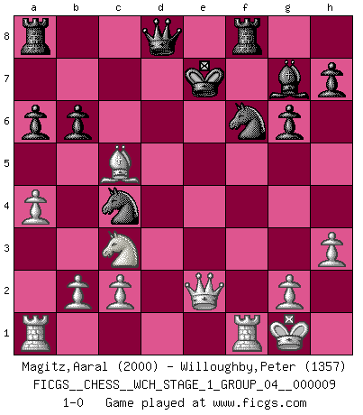 Last move : 1-0 2011 April 26 11:41:30 [Event "FICGS__CHESS__WCH_STAGE_1_GROUP_04__000009"] [Site "FICGS"] [Date "2011.04.01"] [Round "1"] [White "Magitz,Aaral"] [Black "Willoughby,Peter"] [Result "1-0"] [WhiteElo "2000"] [BlackElo "1357"] 1.e4 g6 2.d4 Bg7 3.Nf3 c5 4.d5 d6 5.Bd3 Bg4 6.O-O Nf6 7.h3 Bxf3 8.Qxf3 O-O 9.Nc3 Nbd7 10.Be2 a6 11.a4 b6 12.Qd3 Ne5 13.Qd1 Ned7 14.Be3 e6 15.dxe6 Ne5 16.f4 Nc6 17.exf7+ Kxf7 18.Bc4+ Ke7 19.e5 dxe5 20.fxe5 Nxe5 21.Qe2 Nxc4 22.Bxc5+ 1-0 Robatsch (Modern) defense Kingside Castling by player White (move 6) Kingside Castling by player Black (move 8) Player White won this chess game. Follow this game move after move (download)We like to think. (Gary Kasparov) Wer wird heute Abend ihr Gegner sein? -- Heute Abend spiele ich gegen die schwarzen Steine. (Akiba Rubinstein) Muchos se han convertido en Maestros de Ajedrez, nadie se ha convertido en el Maestro del Ajedrez. (Siegbert Tarrasch) C'est une question de caractère, Beaucoup de gens perdent leur motivation très vite. D'autres, ils sont rares, peuvent la conserver très longtemps. J'aime les échecs, encore aujourd'hui je suis heureux d'analyser des parties. J'aime toujours gagner, je déteste encore perdre. Bien jouer est important pour mon intégrité intellectuelle et morale. Et puis les échecs vivent en ce moment une période historique grâce à Internet. Ils se développent dans les systèmes éducatifs à travers le monde. Ils sortent de leur ghetto, et c'est mon rôle de mener à bien cette révolution. (Gary Kasparov) The human is the only animal species whose members are able to talk themselves into difficulties that would not otherwise exist. (Wendell Johnson)