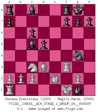 Last move : 0-1 2011 May 10 20:21:32 [Event "FICGS__CHESS__WCH_STAGE_1_GROUP_04__000009"] [Site "FICGS"] [Date "2011.04.01"] [Round "1"] [White "Dsouza,Stanislaus"] [Black "Magitz,Aaral"] [Result "0-1"] [WhiteElo "1220"] [BlackElo "2000"] 1.f4 Nf6 2.Nf3 c5 3.e3 Nc6 4.d4 d5 5.Bb5 e6 6.Nc3 Bd6 7.O-O O-O 8.Ne5 Qc7 9.dxc5 Bxc5 10.Nxc6 bxc6 11.Bd3 e5 12.Bd2 Ng4 13.Qe2 exf4 14.Rf3 fxe3 15.Bxe3 Qxh2+ 16.Kf1 Qh1+ 17.Bg1 Qxg1+ 0-1 Bird's Opening Kingside Castling by player White (move 7) Kingside Castling by player Black (move 7) Player Black won this chess game. Follow this game move after move (download)My style is somewhere between that of Tal and Petrosian. (Reshevsky) Charakterschwächen offenbaren sich normalerweise während einer Schachpartie. (Garry Kasparov) No hay precio que sea tan grande por la cabellera del Rey enemigo. (Koblentz) Si je n'étais pas joueur d'échecs, je serais le meilleur dans quelque chose d'autre. (Anatoli Karpov) A journey of a thousand sites begins with a single click. (Author unknown)
