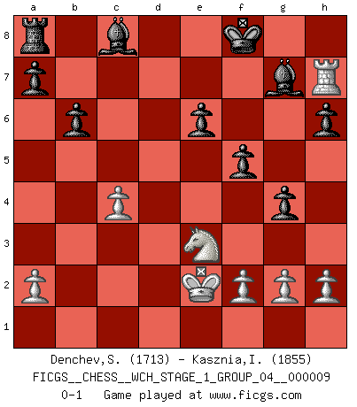 Last move : 0-1 2011 May 27 10:0:36 [Event "FICGS__CHESS__WCH_STAGE_1_GROUP_04__000009"] [Site "FICGS"] [Date "2011.04.01"] [Round "1"] [White "Denchev,Stanimir"] [Black "Kasznia,Ireneusz"] [Result "0-1"] [WhiteElo "1713"] [BlackElo "1855"] 1.c4 c5 2.Nf3 g6 3.d4 cxd4 4.Qxd4 Nf6 5.Nc3 Nc6 6.Qh4 h6 7.e4 Bg7 8.Be2 g5 9.Qg3 d5 10.Nxd5 Nxe4 11.Qc7 O-O 12.O-O e6 13.Qxd8 Rxd8 14.Ne3 b6 15.Rb1 f5 16.Rd1 Bb7 17.b4 Nc3 18.Bb2 Rxd1+ 19.Rxd1 Nxe2+ 20.Kf1 Bxb2 21.Kxe2 g4 22.Ne1 Nxb4 23.Nd3 Nxd3 24.Rxd3 Bf6 25.Rd7 Bc8 26.Rc7 Be5 27.Re7 Kf8 28.Rh7 Bg7 0-1 English : Symmetrical variation Kingside Castling by player Black (move 11) Kingside Castling by player White (move 12) Player Black won this chess game. Follow this game move after move (download)Chess is the art which expresses the science of logic. (Mikhail Botvinnik) Ich möchte Schüler heranbilden, die das Vermögen haben, selbst zu denken und Kritik zu üben. (Emanuel Lasker) Un entendimiento a fondo de las continuaciones típicas del mate, hace de las combinaciones de sacrificio mas complicadas conducirlas a ellas no solo sin dificultad, sino casi de una manera natural. (Siegbert Tarrasch) Roi des jeux et jeu des rois, les échecs portent en eux un sentiment d'infini. Ils donnent à celui qui s'est efforcé d'en approfondir les arcanes l'impression de n'être pas à la mesure de l'homme; en fait, ils constituent un résumé de l'univers, un microcosme, et figurent cette grande échelle qui, dans les plans de la lumière descend jusqu'à la matière, qui des abîmes insondables remonte jusqu'en l'infini de Dieu. (Pyrame) Convictions are more dangerous enemies of truth than lies. (Friedrich Nietzsche)