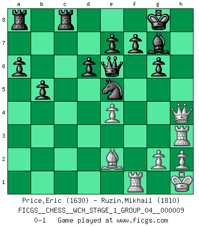 Last move : 0-1 2011 April 13 13:23:33 [Event "FICGS__CHESS__WCH_STAGE_1_GROUP_04__000009"] [Site "FICGS"] [Date "2011.04.01"] [Round "1"] [White "Price,Eric"] [Black "Ruzin,Mikhail"] [Result "0-1"] [WhiteElo "1630"] [BlackElo "1810"] 1.e4 g6 2.Nc3 Bg7 3.d4 c5 4.Nf3 Qa5 5.Be3 Nf6 6.Qd2 cxd4 7.Nxd4 Nc6 8.Nb3 Qc7 9.Be2 O-O 10.f4 d6 11.O-O Bg4 12.Nd5 Nxd5 13.Bxg4 Nxe3 14.Qxe3 Bxb2 15.Rad1 Bg7 16.f5 b5 17.fxg6 hxg6 18.Kh1 Ne5 19.Be2 Nc4 20.Qg5 a6 21.Rd3 Ne5 22.Rh3 Qxc2 23.Qh4 Rfc8 24.Nd4 Qxa2 25.Ne6 Qxe6 0-1 Robatsch (Modern) defense Kingside Castling by player Black (move 9) Kingside Castling by player White (move 11) Player Black won this chess game. Follow this game move after move (download)When I have White, I win because I am white; When I have Black, I win because I am Bogolyubov. (Bogolyubov) Jede Eröffnung ist gut genug um gespielt zu werden, wenn nur ihr Ruf schlecht genug ist. (Savielly Grigorievitsch Tartakower) Hay dos clases de hombres: aquellos que se conforman en dejarse llevar por las circunstancias y que juegan barajas y aquellos decididos a controlar las circunstancias y que juegan al Ajedrez. (Mortimer Collins) Un journaliste : 'Vous préférez avoir une dame de plus sur l'échiquier ou au lit ?' Boris Spassky : 'Ca dépend de la position.' If only people were all showed a certain minimum level of niceness; if only people didn't retract verbal draw offers (without draw box ticked) on ficgs; if only people didn't kill; if only people didn't run concentration / extermination camps, if only people didn't drop nuclear bombs on Hiroshima and Nagasaki, and so on - it would be a much more beautiful world. But sadly, things are not so... (Normajean Yates)