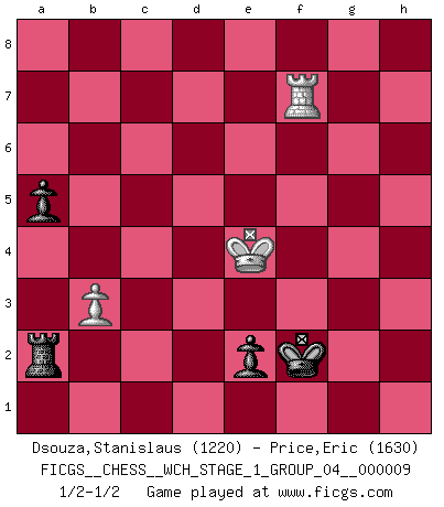 Last move : 1/2-1/2 2011 June 28 15:59:48 [Event "FICGS__CHESS__WCH_STAGE_1_GROUP_04__000009"] [Site "FICGS"] [Date "2011.04.01"] [Round "1"] [White "Dsouza,Stanislaus"] [Black "Price,Eric"] [Result "1/2-1/2"] [WhiteElo "1220"] [BlackElo "1630"] 1.f4 d5 2.Nf3 Nf6 3.e3 e6 4.Be2 Be7 5.O-O O-O 6.b3 c5 7.Bb2 Nc6 8.Ne5 Qc7 9.c4 b6 10.Nxc6 Qxc6 11.Bf3 Bb7 12.Nc3 Rfd8 13.cxd5 exd5 14.Re1 Qe6 15.Qc2 Ne4 16.Nxe4 dxe4 17.Be2 Rd6 18.Bc4 Bd5 19.Bxd5 Qxd5 20.Rad1 Qd3 21.Qxd3 Rxd3 22.Re2 f5 23.h3 h5 24.Be5 Kf7 25.Rc1 Bf6 26.Rc3 Bxe5 27.fxe5 Rad8 28.Rxd3 Rxd3 29.Kf2 Ke6 30.Kg3 Kxe5 31.Kh4 g6 32.Kg5 Rd6 33.g4 hxg4 34.hxg4 b5 35.gxf5 gxf5 36.Rf2 Rf6 37.Rh2 f4 38.exf4+ Rxf4 39.Rh8 Rf2 40.Rc8 Rg2+ 41.Kh4 Rxd2 42.Rxc5+ Kd4 43.Rxb5 Rxa2 44.Rb7 a5 45.Ra7 Ke3 46.Kg3 Ra1 47.Kg2 Ke2 48.Rc7 Ra2 49.Kg3 e3 50.Kf4 Kf2 51.Ke4 e2 52.Rf7+ Kg3 53.Rg7+ Kf2 54.Rf7+ Kg3 55.Rg7+ Kf2 56.Rf7+ 1/2-1/2 Bird's Opening Kingside Castling by player White (move 5) Kingside Castling by player Black (move 5) 10 pieces endgame at move 41 : White KRPP , Black KRPPPP WHITE : King + 1 Rook 2 Pawns BLACK : King + 1 Rook 4 Pawns 9 pieces endgame at move 42 : White KRPP , Black KRPPP WHITE : King + 1 Rook 2 Pawns BLACK : King + 1 Rook 3 Pawns 8 pieces endgame at move 43 : White KRPP , Black KRPP WHITE : King + 1 Rook 2 Pawns BLACK : King + 1 Rook 2 Pawns 7 pieces endgame at move 43 : White KRP , Black KRPP WHITE : King + 1 Rook 1 Pawn BLACK : King + 1 Rook 2 Pawns This chess game ended in a draw. Follow this game move after move (download)Who is your opponent tonight, tonight I am playing against the Black pieces. (Akiba Rubinstein) Zum Sieg gelangt man nicht, wenn man gut, sondern nur wenn man besser spielt (Savielly Grigorievitsch Tartakower) Aquel que ve no otra dirección en el juego que la de dar Jaque Mate a su oponente, nunca será un buen jugador de Ajedrez. (Euwe) On croit qu'il y a plus de mauvais joueurs que de bons joueurs, c'est faux : Il y a autant de joueurs qui gagnent que de joueurs qui perdent. (Philippe Geluck) Pretend inferiority and encourage his arrogance. (Sun Tzu)