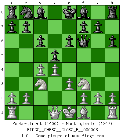 Last move : 1-0 2006 June 15 10:46:58 [Event "FICGS__CHESS__CLASS_E__000003"] [Site "FICGS"] [Date "2006.05.02"] [Round "1"] [White "Parker,Trent"] [Black "Martin,Denis"] [Result "1-0"] [WhiteElo "1400"] [BlackElo "1342"] 1.Nf3 Nf6 2.c4 c6 3.Nc3 d5 4.d4 e6 5.Bg5 h6 6.Bxf6 Qxf6 7.e3 1-0 This chess game has been lost on time (started : 2006.05.02 13:40:26) Reti Opening Player White won this chess game. Follow this game move after move (download)In blitz, the Knight is stronger than the Bishop. (Vlastimil Hort) Ich spiele ehrlich und spiele, um zu gewinnen. Wenn ich verliere nehme ich meine Medizin. (Robert James Fischer) Un Peón pasado es un criminal, quién debe ser mantenido bajo candado y llave. Leves medidas, tales como vigilancia policiaca, no son suficientes. (Aaron Nimzovich) Il s'avisa de me proposer d'apprendre les échecs qu'il jouait un peu... me voilà forcené des échecs. J'achète un échiquier, je m'enferme dans ma chambre, j'y passe des jours et des nuits à vouloir apprendre par cœur toutes les parties. (Jean-Jacques Rousseau, Confessions) Empty your mind, be formless, shapeless — like water. (Bruce Lee)