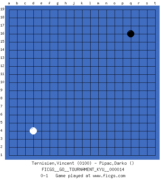 Last move : 0-1 2007 January 15 6:21:29 [Event "FICGS__GO__TOURNAMENT_KYU__000014"] [Site "FICGS"] [Date "2006.12.15"] [Round "1"] [Black "Ternisien,Vincent"] [White "Pipac,Darko"] [Result "0-1"] [Rating 1 "0100"] 1.q16 d4 0-1 This go game has been lost on time (started : 2006.12.15 2:14:43) Here are the names of the openings (joseki) played in the four corners : Corner d4 : d4 0-1 Hoshi (Hwajeom, Seongjeom, Xingwei`) 4-4 Point. The star or hoshi (4-4) point, emphasizing influence at the potential expense of territory. Player White won this Go (weiqi, baduk) game. Follow this game move after move (download)If there is no stone on the handicap point, the carpenter's square is dead. (Anonymous) A generalist learns less and less about more and more until he knows nothing about everything. (Author unknown)