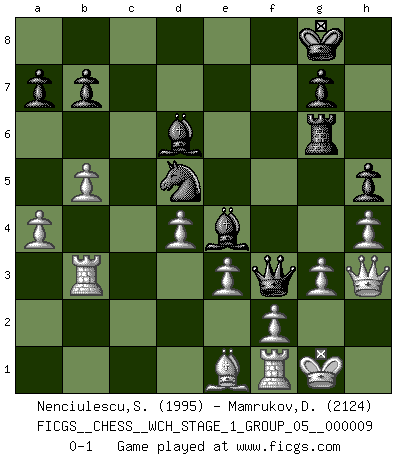 Last move : 0-1 2011 June 21 18:9:1 [Event "FICGS__CHESS__WCH_STAGE_1_GROUP_05__000009"] [Site "FICGS"] [Date "2011.04.01"] [Round "1"] [White "Nenciulescu,Silviu"] [Black "Mamrukov,Dmitri"] [Result "0-1"] [WhiteElo "1995"] [BlackElo "2124"] 1.d4 d5 2.c4 c6 3.Nf3 Nf6 4.cxd5 cxd5 5.Nc3 Nc6 6.Bf4 Nh5 7.Bd2 e6 8.e3 Bd6 9.Bd3 f5 10.O-O O-O 11.Ne5 Bxe5 12.Qxh5 Bd6 13.Rac1 Bd7 14.Qf3 Be8 15.Nb5 Be7 16.Nc3 Bd6 17.g3 Rc8 18.Ne2 Rf7 19.Rc2 Rfc7 20.Rfc1 Bf7 21.h4 Qe8 22.Nf4 e5 23.Nxd5 e4 24.Nxc7 Rxc7 25.Qxf5 exd3 26.Rc3 Be6 27.Qxd3 Bd5 28.a3 Re7 29.Qf5 Be4 30.Qg4 h5 31.Qh3 Qf7 32.b4 Qf3 33.Rf1 Rf7 34.b5 Ne7 35.Rb3 Nd5 36.a4 Rf6 37.Be1 Rg6 0-1 QGD Slav : Exchange variation Kingside Castling by player White (move 10) Kingside Castling by player Black (move 10) Player Black won this chess game. Follow this game move after move (download)The only thing Chess players have in common is Chess. (Lodewijk Prins) Je mehr wir mit Computern analysieren, desto mehr glauben wir an Verteidigung. (Vladimir Kramnik) Un entendimiento minucioso de las típicas continuaciones de mate hacen de las mas complicadas combinaciones de sacrificio que conducen hacia ellas no solo no dificiles, sino casi un asunto de rutina. (Siegbert Tarrasch) Soyez une menace à chaque fois que vous vous asseyez pour jouer. (Ken Smith) Every man's memory is his private literature. (Aldous Huxley)