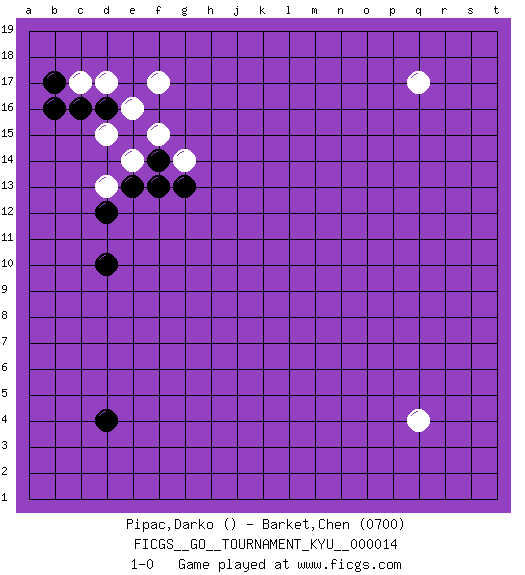 Last move : 1-0 2007 February 19 23:9:18 [Event "FICGS__GO__TOURNAMENT_KYU__000014"] [Site "FICGS"] [Date "2006.12.15"] [Round "1"] [Black "Pipac,Darko"] [White "Barket,Chen"] [Result "1-0"] [Rating 2 "0700"] 1.d10 q4 2.d16 q17 3.d4 f17 4.e15 c17 5.c16 d17 6.b16 f15 7.b17 e16 8.f14 g14 9.g13 e14 10.f13 d15 11.e13 d13 12.d12 1-0 This go game has been lost on time (started : 2006.12.15 2:14:43) Here are the names of the openings (joseki) played in the four corners : Corner d16 : d16 f17 Hoshi (Hwajeom, Seongjeom, Xingwei`) 4-4 Point. The star or hoshi (4-4) point, emphasizing influence at the potential expense of territory. Ikken Kakari (Hankan Keolch'im, Yi Gua`jiao~, 1-Space Low Approach). White 2 is the standard approach move to the 4-4. Corner d4 : d4 1-0 Hoshi (Hwajeom, Seongjeom, Xingwei`) 4-4 Point. The star or hoshi (4-4) point, emphasizing influence at the potential expense of territory. Player Black won this Go (weiqi, baduk) game. Follow this game move after move (download)Do not make moves that strengthen your opponent ! (Anonymous) Go and wake up your luck. (Persian saying)