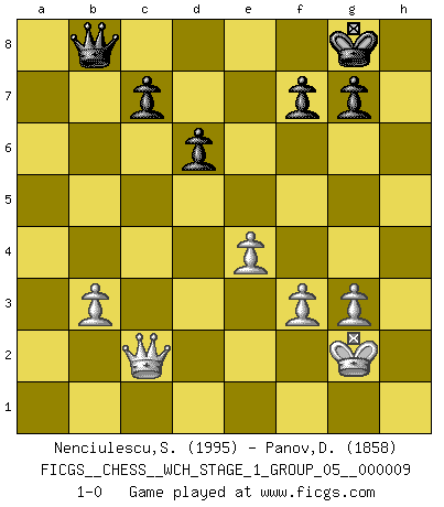 Last move : 1-0 2011 August 2 9:4:3 [Event "FICGS__CHESS__WCH_STAGE_1_GROUP_05__000009"] [Site "FICGS"] [Date "2011.04.01"] [Round "1"] [White "Nenciulescu,Silviu"] [Black "Panov,Dmitriy"] [Result "1-0"] [WhiteElo "1995"] [BlackElo "1858"] 1.d4 Nf6 2.c4 e6 3.Nf3 Bb4+ 4.Bd2 Bxd2+ 5.Qxd2 O-O 6.Nc3 d6 7.g3 Qe7 8.Bg2 e5 9.O-O Re8 10.e4 Bg4 11.Ne1 exd4 12.Qxd4 Nc6 13.Qd2 h5 14.Nd5 Qd8 15.f3 Bd7 16.Qc3 Ne5 17.Nf4 h4 18.Rd1 a5 19.Ned3 hxg3 20.hxg3 b5 21.cxb5 Bxb5 22.Nxe5 Rxe5 23.Rf2 Qb8 24.Rc2 Rc5 25.Qd2 Rxc2 26.Qxc2 Ra6 27.Bf1 Rb6 28.Bxb5 Rxb5 29.Nd3 Nd7 30.b3 Nc5 31.Kg2 Nxd3 32.Rxd3 a4 33.Rc3 axb3 34.Rxb3 Rxb3 35.axb3 1-0 This chess game has been lost on time (started : 2011.04.01 10:6:14) Bogo-Indian defense Kingside Castling by player Black (move 5) Kingside Castling by player White (move 9) Player White won this chess game. Follow this game move after move (download)Discovered check is the dive bomber of the Chessboard. (Reuben Fine) Wenn Spassky eine Figur opfert kannst du genauso gut aufgeben. Aber wenn Tal eine Figur opfert, spiel weiter. Er könnte noch eine weitere opfern, und dann ... wer weiß? (Miguel Najdorf) Bendita sea la memoria de aquel que dio al mundo este juego inmortal. (A. G. Gardiner) Les Cavaliers se révèlent fort utiles dans les positions fermées. D'habitude, les Fous sont un peu plus forts que les Cavaliers dans les positions ouvertes. Qu'on le veuille ou non, il restera toujours des exceptions ! Real knowledge is to know the extent of one's ignorance. (Confucius)