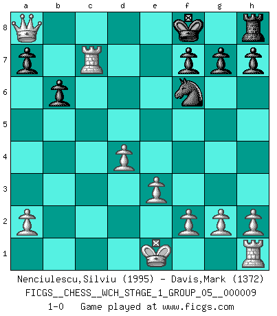 Last move : 1-0 2011 May 22 7:29:43 [Event "FICGS__CHESS__WCH_STAGE_1_GROUP_05__000009"] [Site "FICGS"] [Date "2011.04.01"] [Round "1"] [White "Nenciulescu,Silviu"] [Black "Davis,Mark"] [Result "1-0"] [WhiteElo "1995"] [BlackElo "1372"] 1.d4 d5 2.c4 c6 3.Nf3 Nf6 4.Nc3 e6 5.cxd5 cxd5 6.Bg5 Bb4 7.Qb3 Nc6 8.e3 Ne4 9.Bxd8 Bxc3+ 10.bxc3 Nxd8 11.Bb5+ Nc6 12.Ne5 Bd7 13.Nxd7 Kxd7 14.Bxc6+ Kxc6 15.c4 b6 16.cxd5+ exd5 17.Rc1+ Kd6 18.Qb4+ Ke6 19.Rc6+ Kd7 20.Qb5 Ke7 21.Qxd5 Nf6 22.Rc7+ Kf8 23.Qxa8+ 1-0 QGD Slav : 4.Nc3 Player White won this chess game. Follow this game move after move (download)After black's reply to 1.e4 with 1..e5, leaves him always trying to get into the game. (Howard Staunton) Das typische an einem Großmeister ist, daß er eine gewonnene Position schnell und schmerzlos gewinnt. (Irving Chernev) Aquellos que dicen entender al Ajedrez, no entienden nada. (Robert Hubner) La menace est plus forte que l'exécution. (Aaron Nimzovitch) Establishing goals is all right if you don't let them deprive you of interesting detours. (Doug Larson)