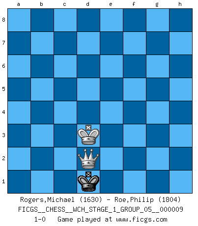 Last move : 1-0 2011 May 5 0:6:27 [Event "FICGS__CHESS__WCH_STAGE_1_GROUP_05__000009"] [Site "FICGS"] [Date "2011.04.01"] [Round "1"] [White "Rogers,Michael"] [Black "Roe,Philip"] [Result "1-0"] [WhiteElo "1630"] [BlackElo "1804"] 1.e4 e5 2.Nf3 Nc6 3.Bc4 Nf6 4.d4 exd4 5.O-O Nxe4 6.Re1 d5 7.Bxd5 Qxd5 8.Nc3 Qa5 9.Nxe4 Be6 10.Neg5 O-O-O 11.Nxe6 fxe6 12.Rxe6 Bd6 13.Bg5 Rde8 14.Qe2 Kd7 15.Rxe8 Rxe8 16.Qd3 h6 17.Bd2 Qh5 18.c3 Ne5 19.Nxe5+ Rxe5 20.h3 dxc3 21.Bxc3 Rd5 22.Qc2 Rg5 23.f4 Rg3 24.Kh2 Rg5 25.g3 Rc5 26.Qa4+ b5 27.Qe4 g5 28.Bd4 Rc4 29.b3 Rxd4 30.Qxd4 Qf3 31.Rd1 gxf4 32.gxf4 Kc8 33.Rd3 Qf1 34.Kg3 Bxf4+ 35.Kg4 Bd6 36.Qd5 Qe2+ 37.Kf5 Qh5+ 38.Kf6 Qh4+ 39.Kg6 a6 40.Re3 Kd7 41.Rf3 Kc8 42.Qa8+ Kd7 43.Rf7+ Ke6 44.Qc8+ Kd5 45.Rf5+ Kd4 46.Qxa6 Be5 47.Qa7+ c5 48.Qd7+ Ke4 49.Rf7 Qg3+ 50.Kh7 Qd3 51.Qf5+ Ke3 52.Qxd3+ Kxd3 53.Rb7 b4 54.Kxh6 Kc2 55.h4 Kb1 56.Ra7 Bb2 57.h5 Ba3 58.Kg5 Kxa2 59.h6 Kxb3 60.Rxa3+ bxa3 61.h7 c4 62.h8Q c3 63.Qb8+ Kc2 64.Qh2+ Kb1 65.Qg1+ Kb2 66.Qb6+ Kc2 67.Qa5 Kb3 68.Qb5+ Kc2 69.Qa4+ Kd2 70.Qa5 a2 71.Qxa2+ c2 72.Kf4 Kd1 73.Ke3 c1Q+ 74.Kd3 Qe3+ 75.Kxe3 Kc1 76.Kd3 Kd1 77.Qd2+ 1-0 Two knights defense Kingside Castling by player White (move 5) Queenside Castling by player Black (move 10) 10 pieces endgame at move 52 : White KRPPP , Black KBPPP WHITE : King + 1 Rook 3 Pawns BLACK : King + 1 Bishop 3 Pawns 9 pieces endgame at move 54 : White KRPPP , Black KBPP WHITE : King + 1 Rook 3 Pawns BLACK : King + 1 Bishop 2 Pawns 8 pieces endgame at move 58 : White KRPP , Black KBPP WHITE : King + 1 Rook 2 Pawns BLACK : King + 1 Bishop 2 Pawns 7 pieces endgame at move 59 : White KRP , Black KBPP WHITE : King + 1 Rook 1 Pawn BLACK : King + 1 Bishop 2 Pawns 6 pieces endgame at move 60 : White KRP , Black KPP WHITE : King + 1 Rook 1 Pawn BLACK : King + 2 Pawns 5 pieces endgame at move 60 : White KP , Black KPP WHITE : King + 1 Pawn BLACK : King + 2 Pawns Promotion Queen by player White (move 62) 4 pieces endgame at move 71 : White KQ , Black KP WHITE : King + 1 Queen BLACK : King + 1 Pawn Promotion Queen by player Black (move 73) 3 pieces endgame at move 75 : White KQ , Black K WHITE : King + 1 Queen BLACK : King + Player White won this chess game. Follow this game move after move (download)Adequate compensation for a sacrifice is having a sound combination leading to a winning position; adequate compensation for a blunder is having your opponent snatch defeat from the jaws of victory. (Bruce A. Moon) Es liegt in der Natur, vernüftig zu denken und unlogisch zu handeln. (Anatole France) En la vida, como en el Ajedrez, los Peones propios obstruyen nuestro camino. La gran fortuna de un hombre, su comodidad, placer, hijos, libros, que deberían ayudarle a ganar, con mucha frecuencia lo ponen en Jaque Mate. (Charles Buxton) Dieu déplace le joueur, et celui-ci la pièce. Quel Dieu derrière Dieu commence donc la trame ? Arturo Perez-Reverte (prix de littérature policière 1993). Over-the-board chess is the favorite of mortals, correspondence chess is the favorite of the gods. (Eduard Dyckhoff)