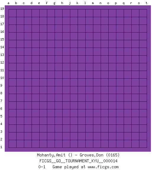 Last move : 0-1 2007 January 14 6:4:21 [Event "FICGS__GO__TOURNAMENT_KYU__000014"] [Site "FICGS"] [Date "2006.12.15"] [Round "1"] [Black "Mohanty,Amit"] [White "Groves,Don"] [Result "0-1"] [Rating 2 "0165"] 0-1 This go game has been lost on time (started : 2006.12.15 2:14:43) Here are the names of the openings (joseki) played in the four corners : Player White won this Go (weiqi, baduk) game. Follow this game move after move (download)To invade, need 20 points in open area; otherwise, keshi is best. (Yang Yilun, 7p) Macintosh - we might not get everything right, but at least we knew the century was going to end. (Douglas Adams)