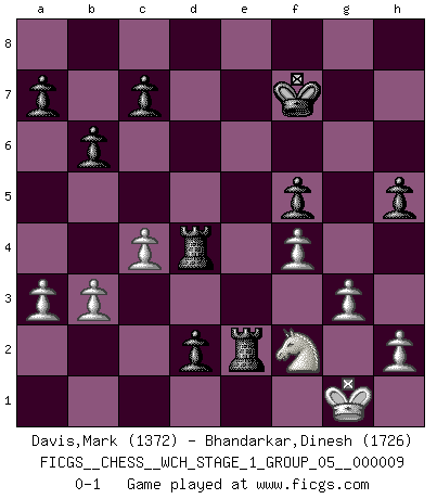 Last move : 0-1 2011 July 9 1:44:56 [Event "FICGS__CHESS__WCH_STAGE_1_GROUP_05__000009"] [Site "FICGS"] [Date "2011.04.01"] [Round "1"] [White "Davis,Mark"] [Black "Bhandarkar,Dinesh"] [Result "0-1"] [WhiteElo "1372"] [BlackElo "1726"] 1.e4 e5 2.Nf3 Nc6 3.Nc3 Nf6 4.d3 Bc5 5.Bg5 h6 6.Bh4 O-O 7.Be2 Re8 8.O-O Be7 9.a3 Nxe4 10.Bxe7 Nxc3 11.Bxd8 Nxd1 12.Raxd1 Rxd8 13.c3 d5 14.Nd2 d4 15.c4 Ne7 16.Ne4 f5 17.Nc5 b6 18.Nb3 Bb7 19.Nd2 e4 20.dxe4 fxe4 21.Nb3 d3 22.Bg4 Kf7 23.Nd2 g6 24.Rfe1 h5 25.Bh3 Rd4 26.b3 Nf5 27.f4 Re8 28.Nb1 e3 29.Bxf5 gxf5 30.g3 Bf3 31.Nc3 Bxd1 32.Nxd1 e2 33.Nf2 d2 34.Rxe2 Rxe2 0-1 Four knights game Kingside Castling by player Black (move 6) Kingside Castling by player White (move 8) Player Black won this chess game. Follow this game move after move (download)I believe that Chess possesses a magic that is also a help in advanced age. A rheumatic knee is forgotten during a game of Chess and other events can seem quite unimportant in comparison with a catastrophe on the chessboard. (Vlastimil Hort) Je mehr wir mit Computern analysieren, desto mehr glauben wir an Verteidigung. (Vladimir Kramnik) Bobby Fischer es el mas grande genio de Ajedrez de todos los tiempos. (Alexander Kotov) Vouloir jouer aux échecs contre soi-même est aussi paradoxal que vouloir marcher sur son ombre. (Stefan Zweig) Success without honor is an unseasoned dish; it will satisfy your hunger, but it won't taste good. (Joe Paterno)