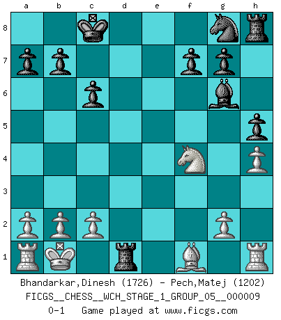 Last move : 0-1 2011 July 13 0:26:4 [Event "FICGS__CHESS__WCH_STAGE_1_GROUP_05__000009"] [Site "FICGS"] [Date "2011.04.01"] [Round "1"] [White "Bhandarkar,Dinesh"] [Black "Pech,Matej"] [Result "0-1"] [WhiteElo "1726"] [BlackElo "1202"] 1.e4 c6 2.d4 d5 3.Nc3 dxe4 4.Nxe4 Bf5 5.Ng3 Bg6 6.N1e2 e5 7.dxe5 Qxd1+ 8.Kxd1 Nd7 9.Bf4 O-O-O 10.h4 Nxe5 11.Kc1 Ng4 12.Be3 Nxe3 13.fxe3 h5 14.Nf4 Bc5 15.Nd3 Bxe3+ 16.Kb1 Bf4 17.Ne2 Rxd3 18.Nxf4 Rd1+ 0-1 Caro-Kann : Classical variation Queenside Castling by player Black (move 9) Player Black won this chess game. Follow this game move after move (download)With or without the title, Bobby Fischer was unquestionably the greatest player of his time. (Burt Hochberg) Man braucht nicht immer den besten Zug zu spielen: Ein Zug muß aktiv, unternehmungslustig, korrekt und schön sein. (David Bronstein) Fischer es una tragedia del Ajedrez Americano a la par con Morphy y Pillsbury. (Mig Greengard) J'ai toujours senti une vague pitié pour l'homme qui ne connaît rien aux échecs, tout comme j'en aurais pour un homme ignorant de l'amour. Les Echecs, comme la musique ou comme l'amour, ont le pouvoir de rendre heureux. (Siegbert Tarrasch) Chess is as much a mystery as women. (Purdy)
