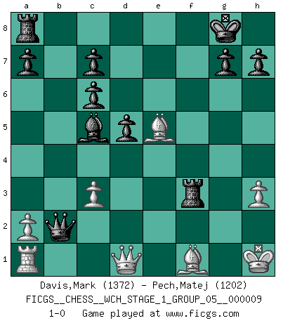 Last move : 1-0 2011 August 11 21:32:15 [Event "FICGS__CHESS__WCH_STAGE_1_GROUP_05__000009"] [Site "FICGS"] [Date "2011.04.01"] [Round "1"] [White "Davis,Mark"] [Black "Pech,Matej"] [Result "1-0"] [WhiteElo "1372"] [BlackElo "1202"] 1.e4 e5 2.Nf3 Nc6 3.d4 exd4 4.Nxd4 Bc5 5.c3 Nf6 6.Nxc6 bxc6 7.Nd2 O-O 8.Bd3 d5 9.e5 Ng4 10.O-O Qh4 11.Nf3 Nxf2 12.Rxf2 Qxf2+ 13.Kh1 Bg4 14.Bf4 f6 15.Bg3 Qxb2 16.h3 Bxf3 17.gxf3 fxe5 18.Bxe5 Rxf3 19.Bf1 1-0 This chess game has been lost on time (started : 2011.04.01 10:6:14) Scotch game Kingside Castling by player Black (move 7) Kingside Castling by player White (move 10) Player White won this chess game. Follow this game move after move (download)As one by one I mowed them down, my superiority soon became apparent. (Jose Capablanca) Jeder Fehler erscheint unglaublich dumm, wenn andre ihn begehen. (Georg Christoph Lichtenberg) Ser exitoso en el Ajedrez te permite descubrir tu propia personalidad. Eso es lo que deseo para los niños de mi clase. (Saudin Robovic) On n'a jamais que l'âge auquel on a commence à jouer aux échecs car après on cesse de vieillir. (Capablanca) Looking at the proliferation of personal web pages on the Net, it looks like very soon everyone on Earth will have 15 megabytes of fame. (M.G. Sriram)