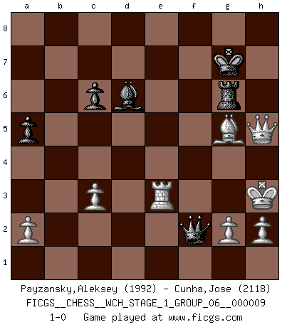 Last move : 1-0 2011 July 30 20:57:12 [Event "FICGS__CHESS__WCH_STAGE_1_GROUP_06__000009"] [Site "FICGS"] [Date "2011.04.01"] [Round "1"] [White "Payzansky,Aleksey"] [Black "Cunha,Jose"] [Result "1-0"] [WhiteElo "1992"] [BlackElo "2118"] 1.e4 c5 2.Nf3 d6 3.d4 cxd4 4.Nxd4 Nf6 5.Nc3 a6 6.Bg5 e6 7.f4 Qb6 8.Qd3 Qxb2 9.Rb1 Qa3 10.f5 Nc6 11.fxe6 fxe6 12.Nxc6 bxc6 13.Be2 Qa5 14.Bd2 Qc7 15.e5 dxe5 16.Ne4 Nxe4 17.Qxe4 Bc5 18.Rf1 g6 19.Bh6 Bf8 20.Be3 Rb8 21.Rxb8 Qxb8 22.Kf2 Bd6 23.Bh6 Qa7+ 24.Kg3 Qc7 25.Bc4 Bf8 26.Be3 Ba3 27.Bh6 Bf8 28.Be3 Ba3 29.Bh6 a5 30.Bb3 Bf8 31.Be3 Bd6 32.Bh6 Bf8 33.Be3 Bb4 34.Bh6 Rg8 35.Ba4 Bb7 36.c3 Bd6 37.Bb3 Qe7 38.Qg4 Ba6 39.Rf2 e4 40.Kh3 g5 41.Bxe6 Be2 42.Rxe2 Rg6 43.Bf7+ Qxf7 44.Bxg5 Kf8 45.Rxe4 Kg7 46.Re3 h5 47.Qxh5 Qf5+ 48.Kh4 Qf2+ 49.Kh3 1-0 This chess game has been lost on time (started : 2011.04.01 10:8:25) Sicilian : Najdorf, 7...Qb6 Player White won this chess game. Follow this game move after move (download)You are for me the Queen on d8 and I am the Pawn on d7 !! (Eduard Gufeld) Der Knackpunkt bei der Konzentration ist, daß wir nur durch sie etwas Neues und Ungewöhnliches am Schachbrett finden können. Sie ist der einzige Weg durch neue neue Ideen eine Überraschung zu bereiten. (Garry Kasparov) Si tu oponente te ofrece un empate, trata de averiguar porque piensa él que esta en una posición peor. (Nigel Short) Si rien de grave n'est détecté lors de l'analyse d'une position, on joue alors le coup. Seconde règle de Blumenfeld. I've never seen so many men wasted so badly. (Blondie in The Good, The Bad and The Ugly)