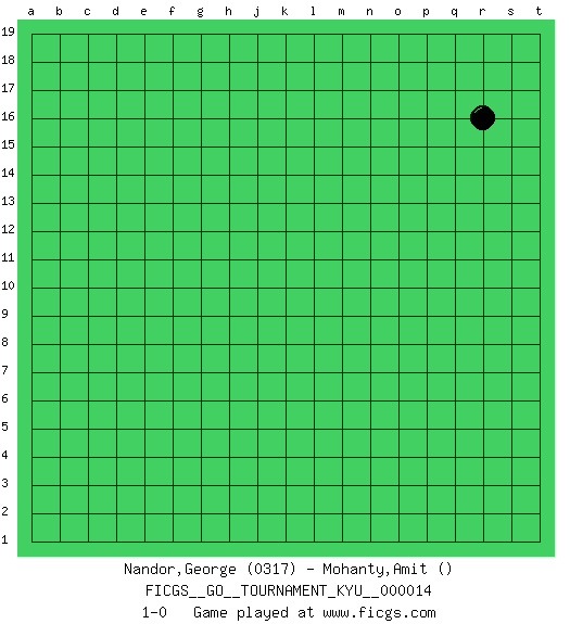 Last move : 1-0 2007 January 14 6:4:21 [Event "FICGS__GO__TOURNAMENT_KYU__000014"] [Site "FICGS"] [Date "2006.12.15"] [Round "1"] [Black "Nandor,George"] [White "Mohanty,Amit"] [Result "1-0"] [Rating 1 "0317"] 1.r16 1-0 This go game has been lost on time (started : 2006.12.15 2:14:43) Here are the names of the openings (joseki) played in the four corners : Player Black won this Go (weiqi, baduk) game. Follow this game move after move (download)Conservative and slow will win. Believe it ! (Anonymous) Programming can only do so much before it becomes too much. (Don Groves)