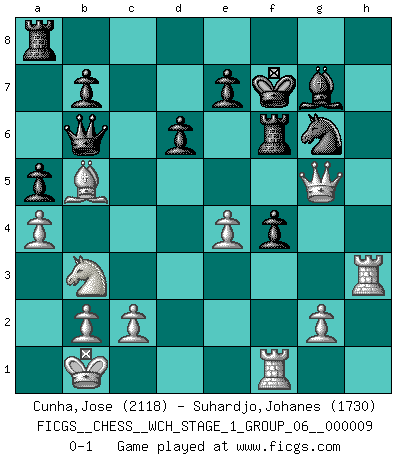 Last move : 0-1 2011 July 31 9:3:49 [Event "FICGS__CHESS__WCH_STAGE_1_GROUP_06__000009"] [Site "FICGS"] [Date "2011.04.01"] [Round "1"] [White "Cunha,Jose"] [Black "Suhardjo,Johanes"] [Result "0-1"] [WhiteElo "2118"] [BlackElo "1730"] 1.e4 c5 2.Nf3 Nc6 3.d4 cxd4 4.Nxd4 Nf6 5.Nc3 d6 6.Be3 Ng4 7.Bg5 h6 8.Bh4 g5 9.Bg3 Bg7 10.Nb3 Be6 11.Qd2 a5 12.Bb5 Qb6 13.a4 O-O 14.h4 f5 15.hxg5 f4 16.Bh4 hxg5 17.Nd5 Bxd5 18.Qxd5+ Rf7 19.Qxg5 Nce5 20.O-O-O Nxf2 21.Bxf2 Qxf2 22.Rh3 Rf6 23.Rdh1 Kf7 24.Rf1 Qb6 25.Kb1 Ng6 0-1 This chess game has been lost on time (started : 2011.04.01 10:8:25) Sicilian defense Kingside Castling by player Black (move 13) Queenside Castling by player White (move 20) Player Black won this chess game. Follow this game move after move (download)Live, lose, and learn, by observing your opponent how to win. (Amber Steenbock) Wenn ich einen Club besuche, sind die Spieler stumm vor Staunen. (José Raúl Capablanca) Un mal plan es mejor que no tener ningún plan. (Frank Marshall) A ce moment-là, je menaçais de comprendre la position ! (Clément L'Heureux) The only difference between a tax man and a taxidermist is that the taxidermist leaves the skin. (Mark Twain)