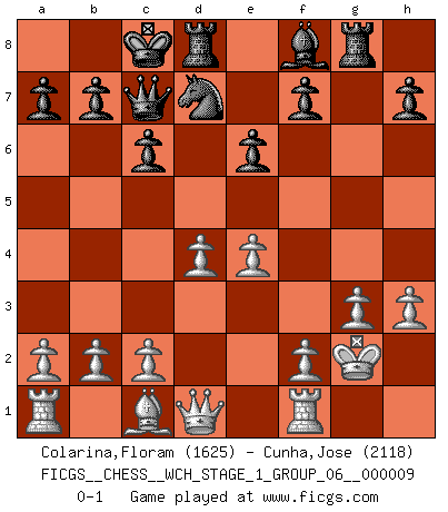 Last move : 0-1 2011 July 10 20:14:10 [Event "FICGS__CHESS__WCH_STAGE_1_GROUP_06__000009"] [Site "FICGS"] [Date "2011.04.01"] [Round "1"] [White "Colarina,Floram"] [Black "Cunha,Jose"] [Result "0-1"] [WhiteElo "1625"] [BlackElo "2118"] 1.d4 d5 2.g3 c6 3.Bg2 Nf6 4.Nf3 Bg4 5.O-O Nbd7 6.Bf4 e6 7.h3 Bf5 8.Nh4 Be4 9.Bxe4 Nxe4 10.Nf3 g5 11.Bc1 Qc7 12.Kg2 Rg8 13.Nc3 g4 14.Nxe4 gxf3+ 15.exf3 dxe4 16.fxe4 O-O-O 0-1 This chess game has been lost on time (started : 2011.04.01 10:8:25) Queen's pawn game Kingside Castling by player White (move 5) Queenside Castling by player Black (move 16) Player Black won this chess game. Follow this game move after move (download)I give 98 percent of my mental energy to Chess. Others give only 2 percent. (Bobby Fischer) Alles was am Schachbrett zählt sind gute Züge. (Robert James Fischer) Es muy difícil jugar en contra de la teoría de Einstein. - en su primera derrota en contra de Fischer (Mikhail Tal) Les Echecs mettent en conflit, non pas deux intelligences, mais deux volontés. (Lasker) The existence of forgetting has never been proved: We only know that some things don't come to mind when we want them. (Friedrich Nietzsche)