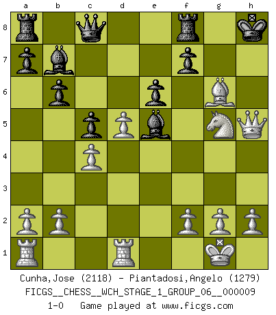 Last move : 1-0 2011 July 6 23:57:13 [Event "FICGS__CHESS__WCH_STAGE_1_GROUP_06__000009"] [Site "FICGS"] [Date "2011.04.15"] [Round "1"] [White "Cunha,Jose"] [Black "Piantadosi,Angelo"] [Result "1-0"] [WhiteElo "2118"] [BlackElo "1279"] 1.e4 e6 2.d4 d5 3.Nc3 dxe4 4.Nxe4 Nd7 5.Nf3 Ngf6 6.Bd3 Be7 7.O-O O-O 8.Nxf6+ Nxf6 9.Qe2 b6 10.c4 Bb7 11.Rd1 Qc8 12.Bf4 c5 13.d5 Nh5 14.Be5 Bf6 15.Ng5 Bxe5 16.Bxh7+ Kh8 17.Qxh5 g6 18.Bxg6 1-0 French : Rubinstein variation Kingside Castling by player White (move 7) Kingside Castling by player Black (move 7) Player White won this chess game. Follow this game move after move (download)White lost because he failed to remember the right continuation and had to think up the moves himself. (Siegbert Tarrasch) Wenn du nicht weißt was du tun sollst, warte bis dein Gegner eine Idee hat. Sie wird sicher schlecht sein. (Siegbert Tarrasch) El Ajedrez es parte de una cultura y si una cultura esta en decadencia, entonces también el Ajedrez declinará. (Mikhail Botvinnik) Echiquier : carré parfait, comme la Jérusalem nouvelle décrite par l'auteur de l'Apocalypse, huit cases sur huit, exaltation du chiffre 4, symbole du cosmos aux quatre horizons... où le noir et le blanc, l'ombre et la lumière, le mal et le bien s'entremêlent et se conjuguent. (Robert Couffignal, Le Gambit du poète) The modern world has divided itself into Conservatives and Progressives. The business of Progressives is to go on making mistakes. The business of the Conservatives is to prevent the mistakes from being corrected. (G.K. Chesterton)
