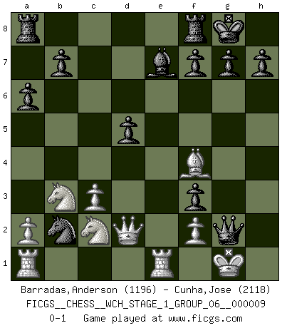 Last move : 0-1 2011 April 20 1:50:48 [Event "FICGS__CHESS__WCH_STAGE_1_GROUP_06__000009"] [Site "FICGS"] [Date "2011.04.01"] [Round "1"] [White "Barradas,Anderson"] [Black "Cunha,Jose"] [Result "0-1"] [WhiteElo "1196"] [BlackElo "2118"] 1.e4 c5 2.Nf3 d6 3.d4 cxd4 4.Nxd4 Nf6 5.h3 e5 6.Nf3 Nxe4 7.Bd3 Nc5 8.Bb5+ Bd7 9.Nc3 Bxb5 10.Nxb5 Be7 11.O-O O-O 12.Re1 Nc6 13.Be3 d5 14.c3 a6 15.Na3 e4 16.Nd4 Nd3 17.Re2 Qd7 18.Nac2 Nxb2 19.Qd2 Ne5 20.Nb3 Nf3+ 21.gxf3 exf3 22.R2e1 Qxh3 23.Bf4 Qg2+ 0-1 Sicilian Kingside Castling by player White (move 11) Kingside Castling by player Black (move 11) Player Black won this chess game. Follow this game move after move (download)Dazzling combinations are for the many, shifting wood is for the few. (Georg Kieninger) Im Blitz ist es einfacher mit einer Figur weniger anzugreifen, als sich mit einer Mehrfigur zu verteidigen. (Mikhail Nekhemyevich Tal) El Ajedrez es un juego de pelea el cual es puramente intelectual e incluye la suerte. (Richard Reti) Le plus grand jeu de l'esprit jamais inventé, plus vous l'apprenez, plus vous y prenez du plaisir. (Garry Kasparov) If you are good, you will be assigned all the work. If you are really good, you will get out of it. (Dan Rotaru)
