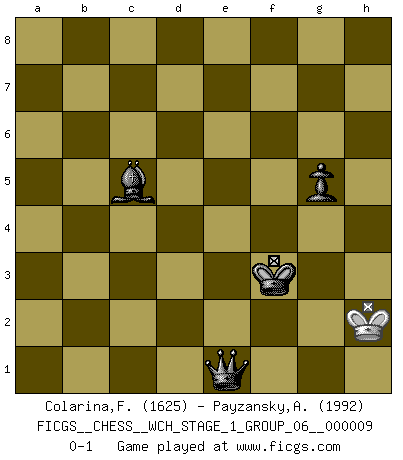 Last move : 0-1 2011 April 29 11:24:40 [Event "FICGS__CHESS__WCH_STAGE_1_GROUP_06__000009"] [Site "FICGS"] [Date "2011.04.01"] [Round "1"] [White "Colarina,Floram"] [Black "Payzansky,Aleksey"] [Result "0-1"] [WhiteElo "1625"] [BlackElo "1992"] 1.e4 c5 2.Nf3 d6 3.Nc3 Nf6 4.Bb5+ Bd7 5.O-O g6 6.Re1 Bg7 7.d4 cxd4 8.Nxd4 O-O 9.Bg5 a6 10.Bxd7 Nbxd7 11.f3 Qb6 12.Be3 Qxb2 13.Qd2 Rfc8 14.Nce2 Qa3 15.Qd3 Qxd3 16.cxd3 Nc5 17.Red1 Nfd7 18.Rab1 b5 19.Nc1 Na4 20.Nce2 e5 21.Nb3 Rc2 22.Rd2 Rac8 23.Rbd1 Nb2 24.Rxc2 Rxc2 25.Rd2 Rxd2 26.Bxd2 Nxd3 27.Nec1 Nxc1 28.Bxc1 Nc5 29.Be3 Bf8 30.Kf2 f5 31.Ke2 Kf7 32.Na1 Na4 33.Kd2 Ke6 34.Nc2 d5 35.Kd3 Nb2+ 36.Kc3 Nd1+ 37.Kd2 Nxe3 38.Kxe3 Bc5+ 39.Kd3 dxe4+ 40.fxe4 fxe4+ 41.Kxe4 a5 42.Na1 a4 43.Nc2 b4 44.Kd3 Kd5 45.g3 h5 46.Ne1 e4+ 47.Kd2 Bd4 48.Nc2 b3 49.axb3 axb3 50.Na3 Bc5 51.Nb1 Bb4+ 52.Ke2 Kd4 53.h3 g5 54.g4 h4 55.Kd1 Ke3 56.Nd2 Kf4 57.Nxb3 Kg3 58.Ke2 Kxh3 59.Ke3 Kxg4 60.Kf2 h3 61.Nc1 Bc5+ 62.Kf1 Kf3 63.Nb3 h2 64.Nd2+ Kf4 65.Kg2 e3 66.Nf3 h1Q+ 67.Kxh1 Kxf3 68.Kg1 e2 69.Kh2 e1Q 0-1 Sicilian Kingside Castling by player White (move 5) Kingside Castling by player Black (move 8) 10 pieces endgame at move 49 : White KNPP , Black KBPPPP WHITE : King + 1 Knight 2 Pawns BLACK : King + 1 Bishop 4 Pawns 9 pieces endgame at move 57 : White KNPP , Black KBPPP WHITE : King + 1 Knight 2 Pawns BLACK : King + 1 Bishop 3 Pawns 8 pieces endgame at move 58 : White KNP , Black KBPPP WHITE : King + 1 Knight 1 Pawn BLACK : King + 1 Bishop 3 Pawns 7 pieces endgame at move 59 : White KN , Black KBPPP WHITE : King + 1 Knight BLACK : King + 1 Bishop 3 Pawns Promotion Queen by player Black (move 66) 6 pieces endgame at move 67 : White KN , Black KBPP WHITE : King + 1 Knight BLACK : King + 1 Bishop 2 Pawns 5 pieces endgame at move 67 : White K , Black KBPP WHITE : King + BLACK : King + 1 Bishop 2 Pawns Promotion Queen by player Black (move 69) Player Black won this chess game. Follow this game move after move (download)During a Chess competition a Chessmaster should be a combination of a beast of prey and a monk. (Alexander Alekhine) Ich verstehe den Grund nicht, warum die Aufteilung in Frauen und Männer überhaupt im Schach besteht. (Judith Polgar) Los tropiezos estan todos ahí en el tablero, esperando que se cometan. (Savielly Tartakover) Les Echecs, c'est l'art de la guerre sans les charniers, c'est la résurrection des morts tombés au champ d'honneur, l'espoir perpétuel, la suprématie de l'intelligence sur la force, la culture de l'esprit. (F. Szpiner) War is the child of passion, passion is the child of narcissism and narcissism is the child. (...) Another game ? (Thibault de Vassal)