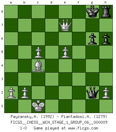 Last move : 1-0 2011 May 25 0:40:32 [Event "FICGS__CHESS__WCH_STAGE_1_GROUP_06__000009"] [Site "FICGS"] [Date "2011.04.15"] [Round "1"] [White "Payzansky,Aleksey"] [Black "Piantadosi,Angelo"] [Result "1-0"] [WhiteElo "1992"] [BlackElo "1279"] 1.e4 c5 2.Nf3 d6 3.d4 cxd4 4.Nxd4 Nf6 5.Nc3 a6 6.Bg5 e6 7.f4 Be7 8.Qf3 Qc7 9.O-O-O Nc6 10.Nxc6 bxc6 11.e5 dxe5 12.fxe5 Nd5 13.Bxe7 Qxe7 14.Ne4 h6 15.Nd6+ Kf8 16.c4 Nc7 17.Qxc6 Rb8 18.Nxc8 Rxc8 19.Rd7 Qe8 20.Qd6+ Kg8 21.Rxc7 g6 22.Rxc8 Qxc8 23.c5 Kg7 24.Bxa6 Qa8 25.Rf1 Qxg2 26.Rxf7+ Kxf7 27.Qd7+ Kf8 28.Qd8+ Kg7 29.Qe7+ Kg8 30.Qxe6+ Kg7 31.Qe7+ Kg8 32.Bc4+ 1-0 Sicilian : Najdorf, 7...Be7 Queenside Castling by player White (move 9) Player White won this chess game. Follow this game move after move (download)Your body has to be in top condition. Your Chess deteriorates as your body does. You can't separate body from mind. (Bobby Fischer) Ich las kürzlich ein Buch von Nietzsche. Er sagte Religion verdumme nur die Menschen. Ich stimme zu. (Robert James Fischer) Nos gusta pensar. (Gary Kasparov) Vous savez, camarade Pachman, je n'éprouve pas de plaisir à être ministre, je jouerais plutôt aux échecs comme vous, ou alors ferais une révolution au Venezuela. (Che Guevara à Ludek Pachman, 'Checkmate in Prague', 1975) Good luck. You're gonna need it. (Han Solo in Star Wars ep.6)