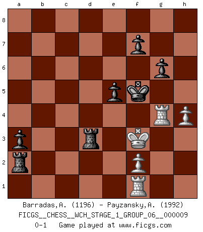 Last move : 0-1 2011 April 5 3:7:42 [Event "FICGS__CHESS__WCH_STAGE_1_GROUP_06__000009"] [Site "FICGS"] [Date "2011.04.01"] [Round "1"] [White "Barradas,Anderson"] [Black "Payzansky,Aleksey"] [Result "0-1"] [WhiteElo "1196"] [BlackElo "1992"] 1.e4 c5 2.Nf3 d6 3.d4 cxd4 4.Nxd4 Nf6 5.Nc3 g6 6.Bg5 Bg7 7.Bxf6 Bxf6 8.Nd5 e6 9.Bb5+ Bd7 10.Nc3 O-O 11.Bxd7 Qxd7 12.O-O Nc6 13.Nxc6 Qxc6 14.Qd3 Rac8 15.Nd1 Qxc2 16.Qxc2 Rxc2 17.Rb1 Rfc8 18.Nc3 Bxc3 19.bxc3 R8xc3 20.Rxb7 Rxa2 21.Rd7 Rd3 22.h3 R3d2 23.h4 h5 24.Rc7 d5 25.exd5 Rxd5 26.Rb1 R5d2 27.Rf1 a5 28.Rc8+ Kg7 29.Rc4 a4 30.g4 hxg4 31.Rxg4 a3 32.Ra4 e5 33.Kg2 Kf6 34.Kf3 Kf5 35.Rg4 Rd3+ 0-1 Sicilian : Dragon variation Kingside Castling by player Black (move 10) Kingside Castling by player White (move 12) Player Black won this chess game. Follow this game move after move (download)Winning isn't everything... but losing is nothing. (Mednis) Besser ein falscher Plan, logisch durchgeführt, als gar kein Plan. (Viktor Kortschnoi) Es muy difícil jugar en contra de la teoría de Einstein. - en su primera derrota en contra de Fischer (Mikhail Tal) Il n'y a plus de joueurs du niveau de Jacob Murray dont la seule quête est le beau jeu, le plaisir de voir les pièces construire quelque chose. Sur 10 idées à la minute, 9 seront sans intérêt, la dernière s'avèrera géniale. (Christian Bauer) Never was anything great achieved without danger. (Niccolo Machiavelli)