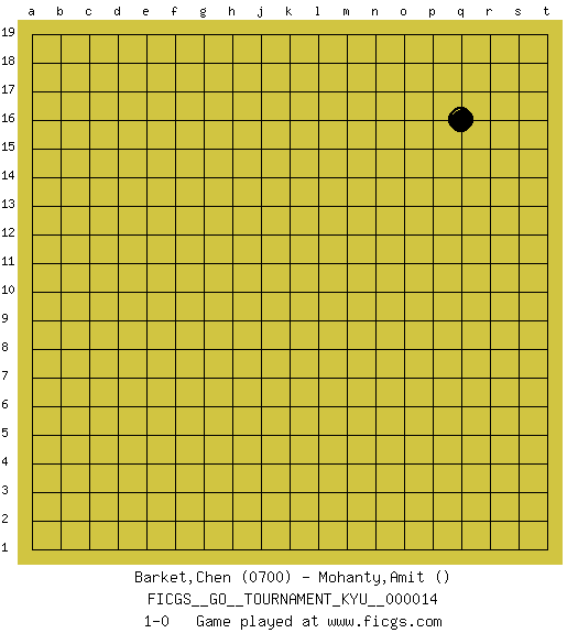 Last move : 1-0 2007 January 15 0:10:44 [Event "FICGS__GO__TOURNAMENT_KYU__000014"] [Site "FICGS"] [Date "2006.12.15"] [Round "1"] [Black "Barket,Chen"] [White "Mohanty,Amit"] [Result "1-0"] [Rating 1 "0700"] 1.q16 1-0 This go game has been lost on time (started : 2006.12.15 2:14:43) Here are the names of the openings (joseki) played in the four corners : Player Black won this Go (weiqi, baduk) game. Follow this game move after move (download)Very few good moves are played. (Pierre Audouard) The production of too many useful things results in too many useless people. (Karl Marx)