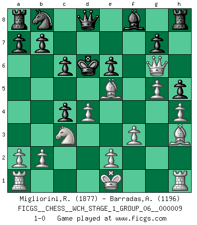 Last move : 1-0 2011 April 20 18:5:23 [Event "FICGS__CHESS__WCH_STAGE_1_GROUP_06__000009"] [Site "FICGS"] [Date "2011.04.01"] [Round "1"] [White "Migliorini,Roberto"] [Black "Barradas,Anderson"] [Result "1-0"] [WhiteElo "1877"] [BlackElo "1196"] 1.d4 d5 2.Nf3 Nf6 3.c4 c6 4.Nc3 Bg4 5.Ne5 e6 6.f3 Bf5 7.g4 Bg6 8.h4 h5 9.g5 Nfd7 10.Nxg6 fxg6 11.Qc2 dxc4 12.Qxg6+ Ke7 13.Bh3 Kd6 14.Bf4+ Ne5 15.Bxe5+ 1-0 Queen's pawn game Player White won this chess game. Follow this game move after move (download)A strong memory, concentration, imagination, and a strong will is required to become a great Chess player. (Bobby Fischer) Ivan Sokolov treibt mich als Beifahrer an mit go Loeky go - . (Loek van Wely) Uno por uno, yo los acribillé, mi superioridad muy pronto se volvio aparente. (Jose Capablanca) Les erreurs sont comme les malheurs, elles n'arrivent jamais seules. (Siegbert Tarrasch) The problem with troubleshooting is that trouble shoots back. (Anonymous)